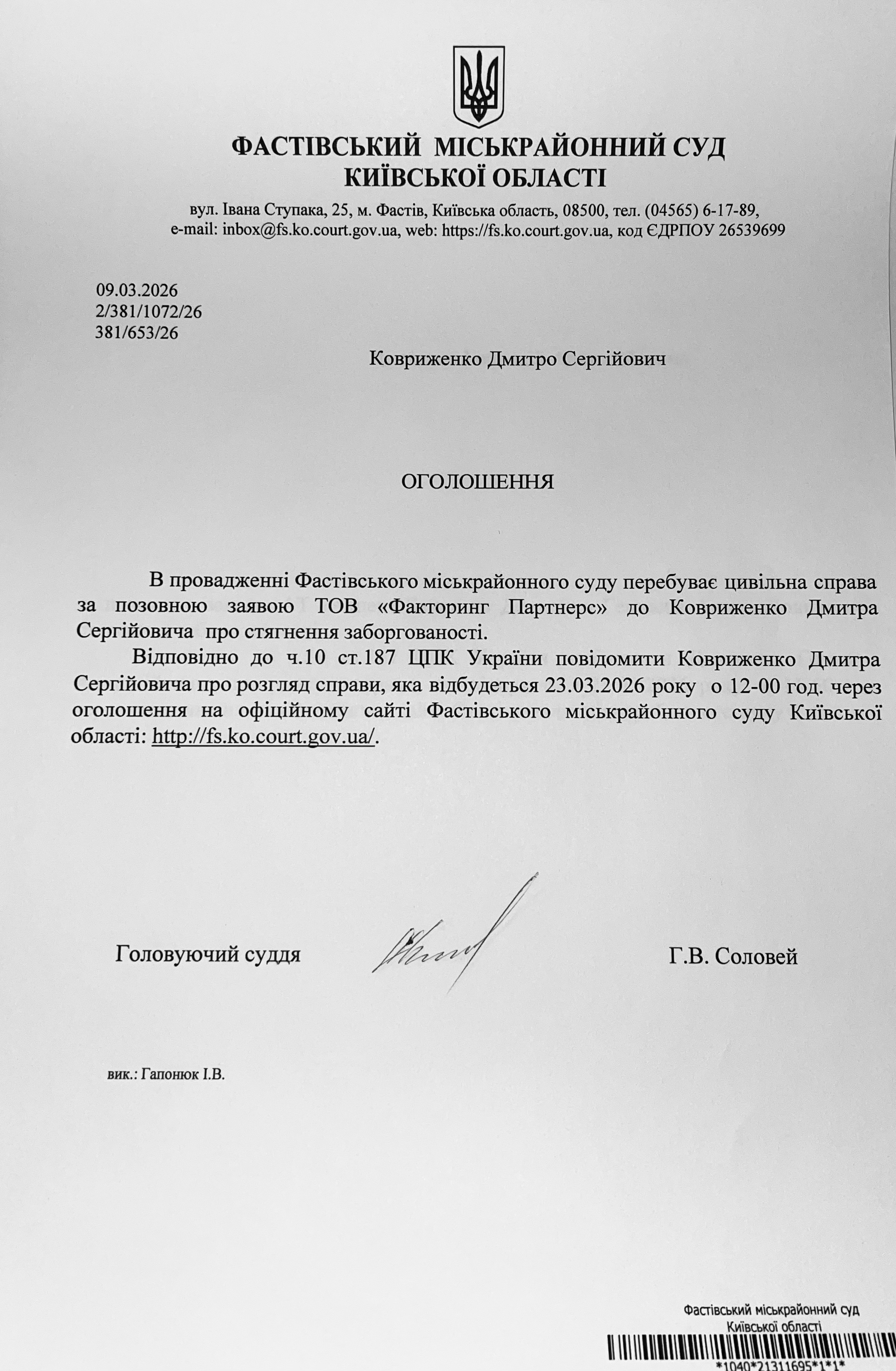 Фастівський міськрайонний суд Київської області викликає Ковриженка Дмитра Сергійовича