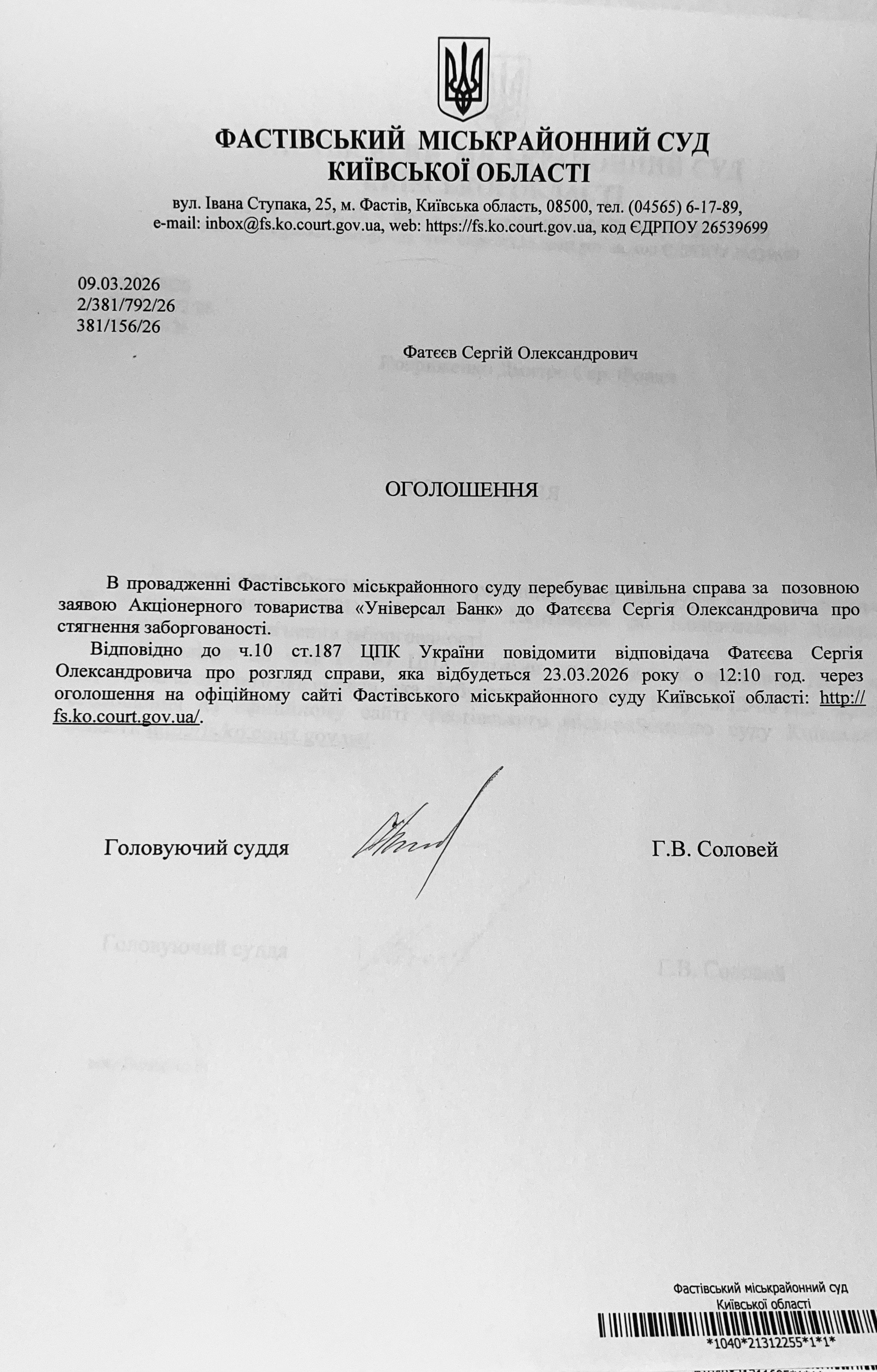 Фастівський міськрайонний суд Київської області викликає Фатєєва Сергія Олександровича