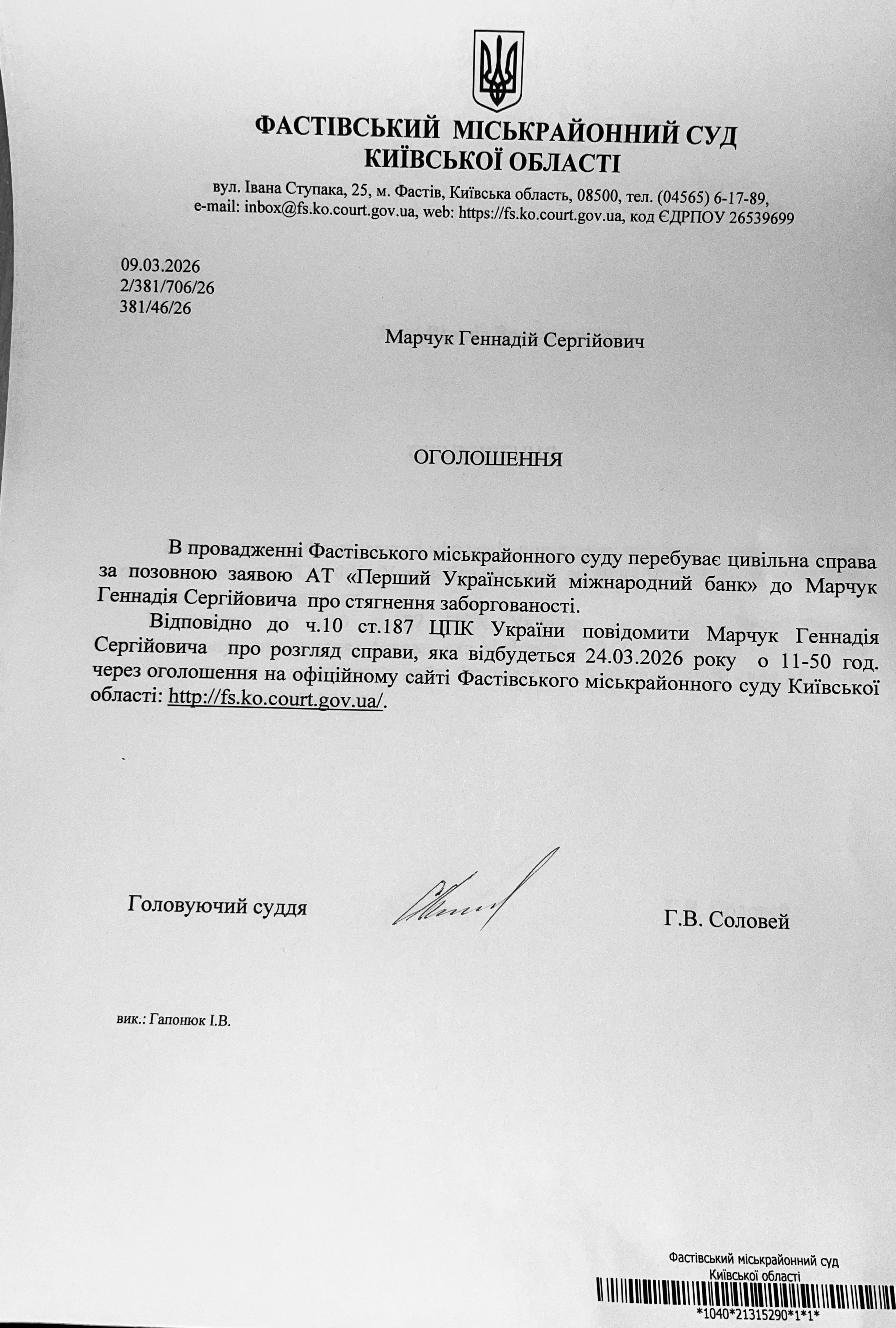 Фастівський міськрайонний суд Київської області викликає Марчука Геннадія Сергійовича