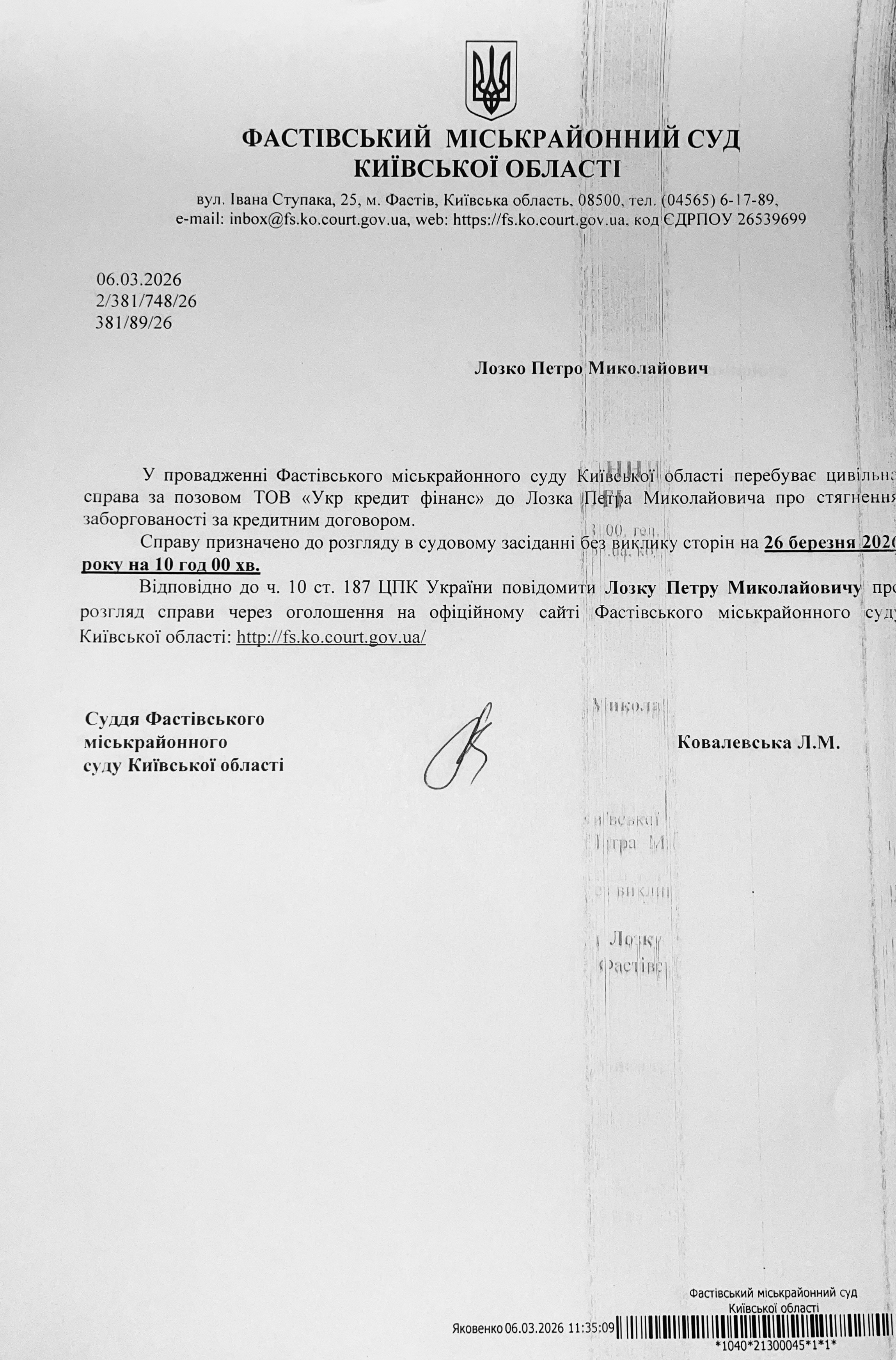 Фастівський міськрайонний суд Київської області викликає Лозка Петра Миколайовича