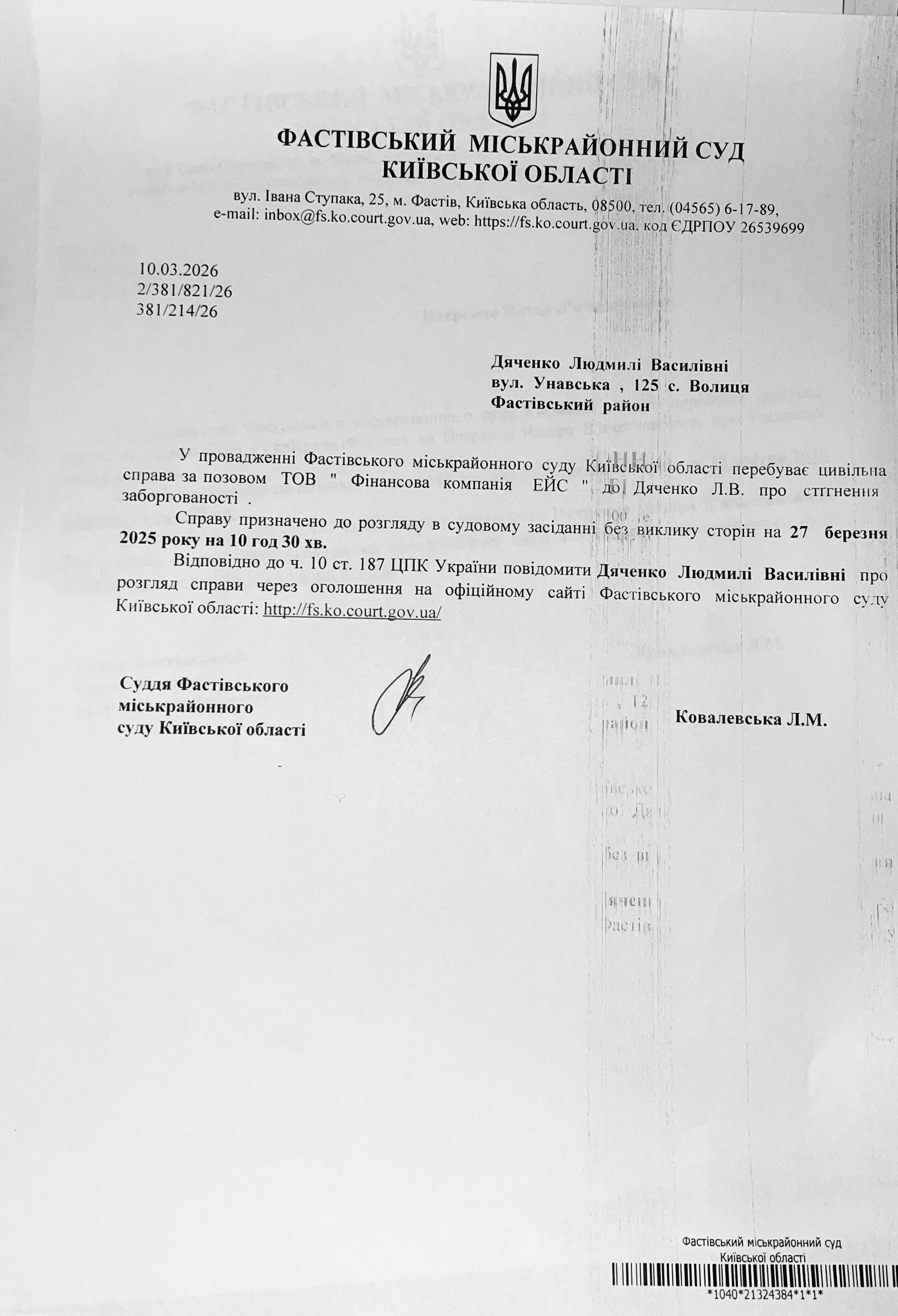 Фастівський міськрайонний суд Київської області викликає Дяченко Людмилу Василівну