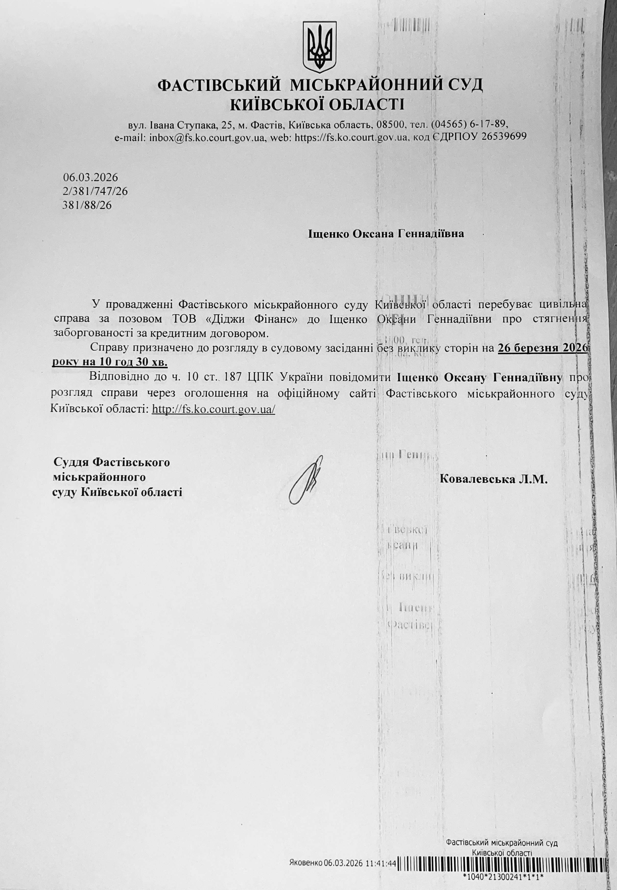 Фастівський міськрайонний суд Київської області викликає Іщенко Оксану Геннадіївну
