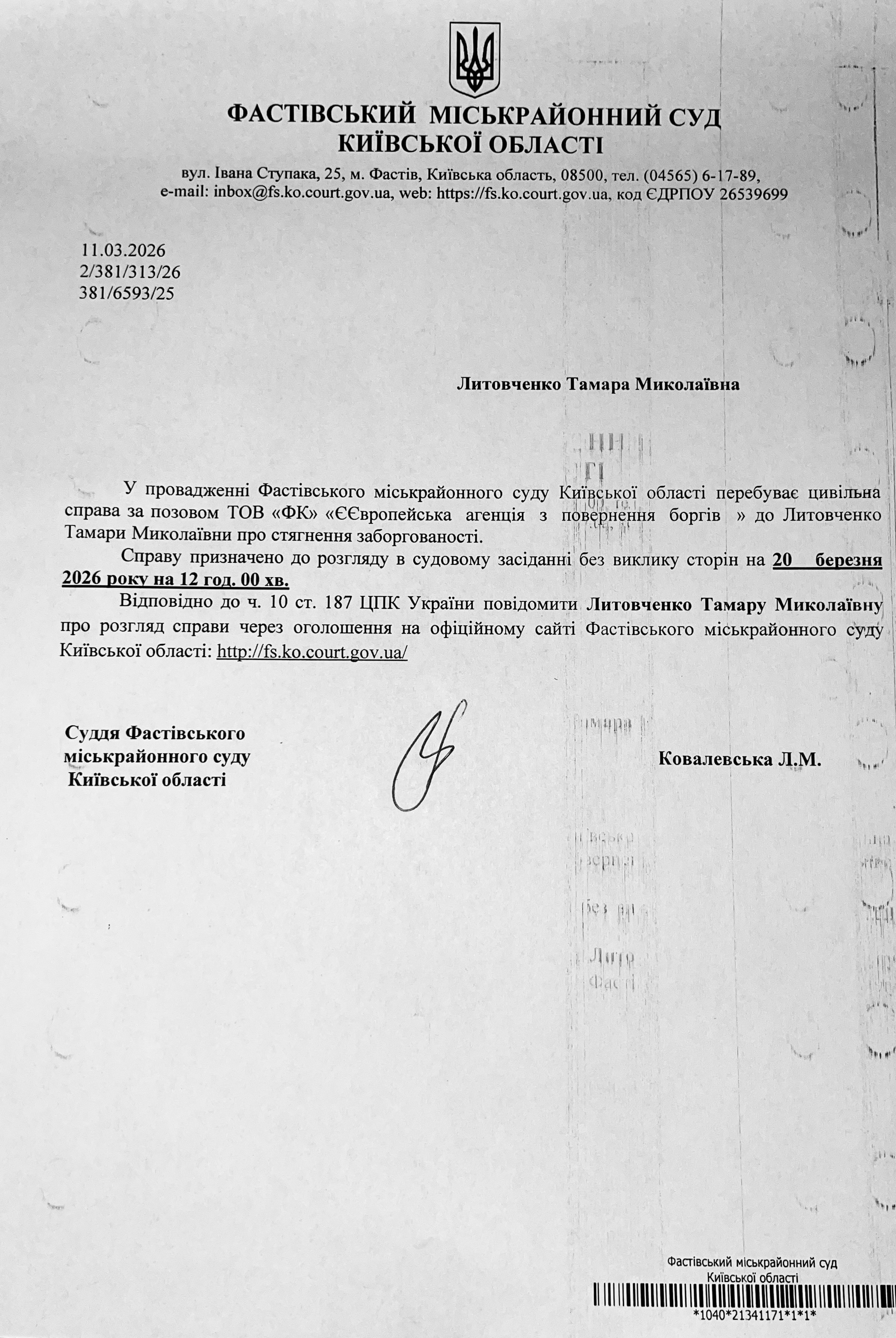 Фастівський міськрайонний суд Київської області викликає Литовченко Тамару Миколаївну