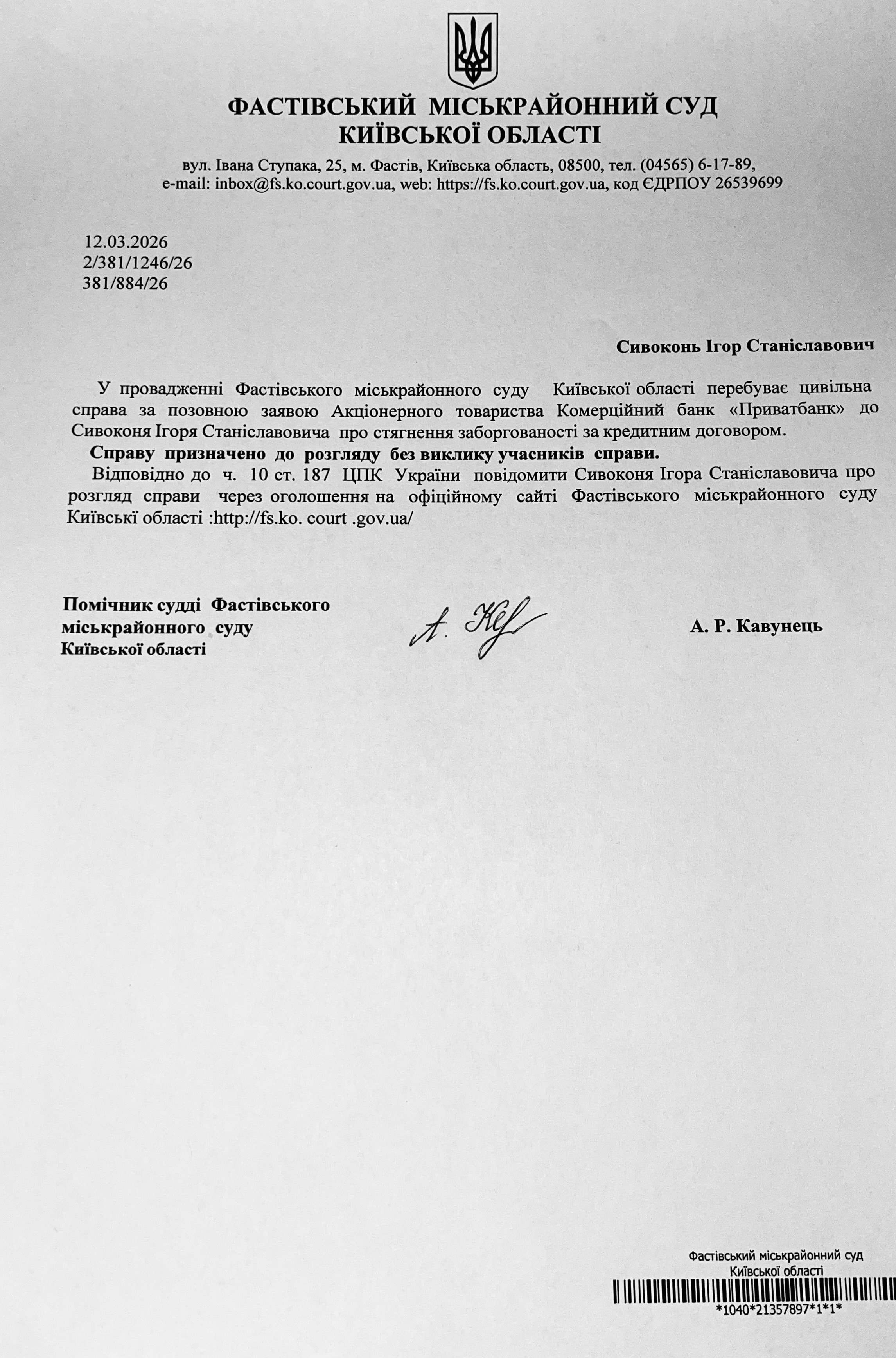 Фастівський міськрайонний суд Київської області викликає Сивоконь Ігоря Станіславовича