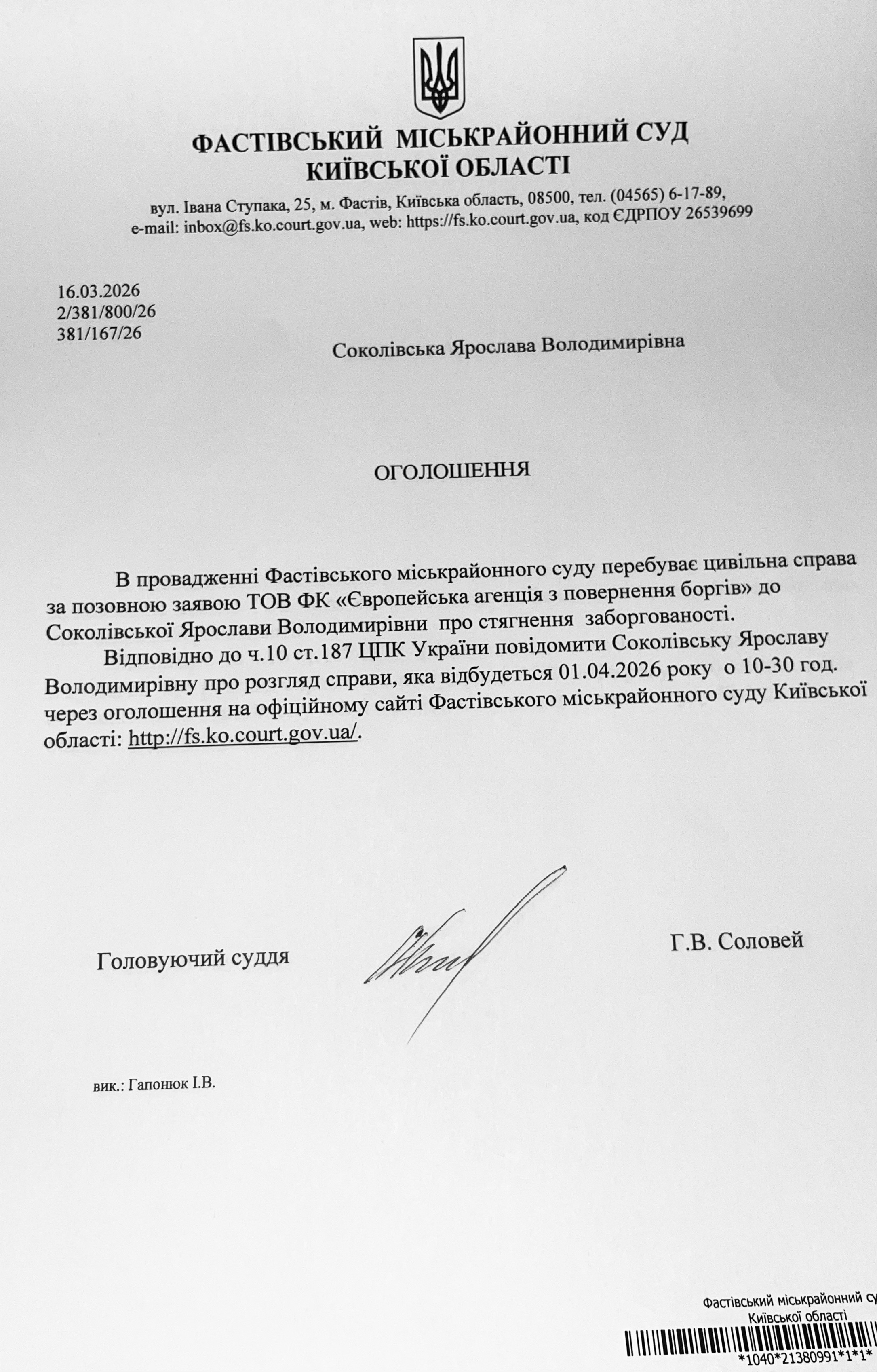 Фастівський міськрайонний суд Київської області викликає Соколівську Ярославу Володимирівну