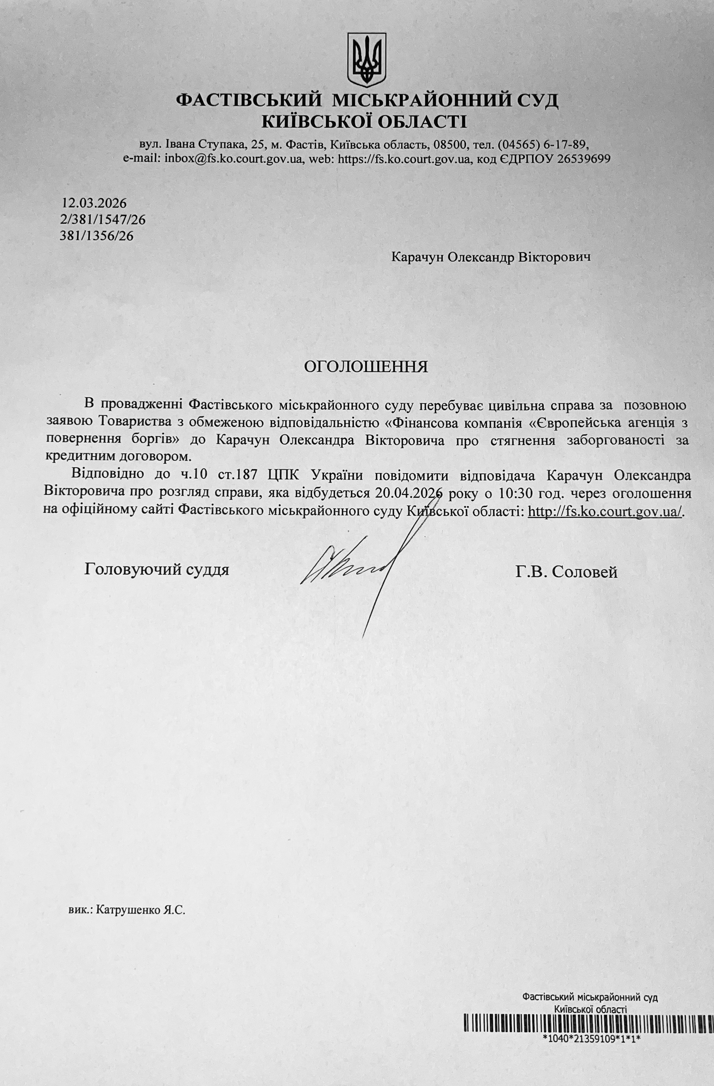 Фастівський міськрайонний суд Київської області викликає Карачуна Олександра Вікторовича