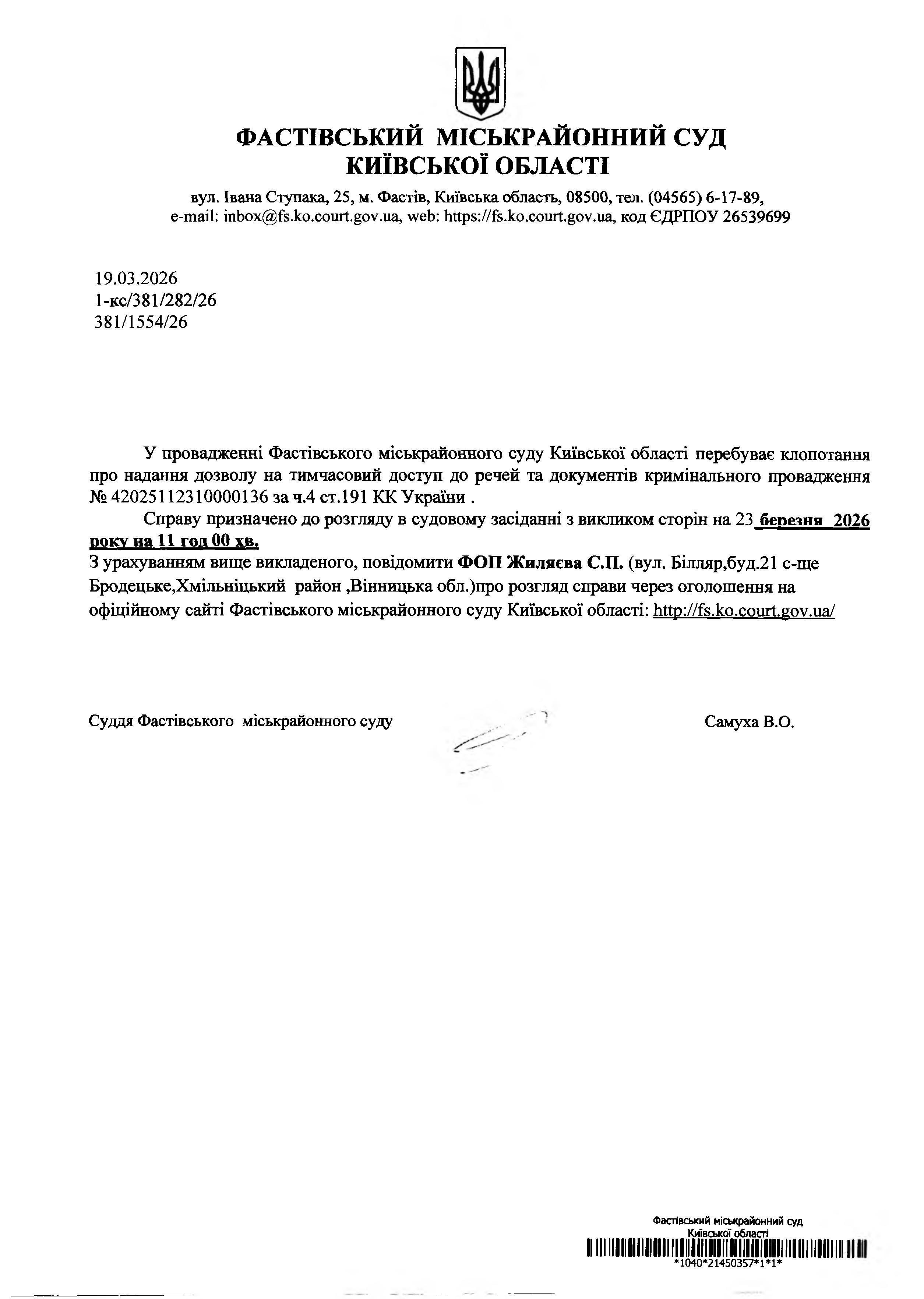 У провадженні Фастівського міськрайонного суду Київської області перебуває клопотання про надання дозволу на тимчасовий доступ до речей та документів кримінального провадження №42025112310000136 зач.4ст.191 КК України .