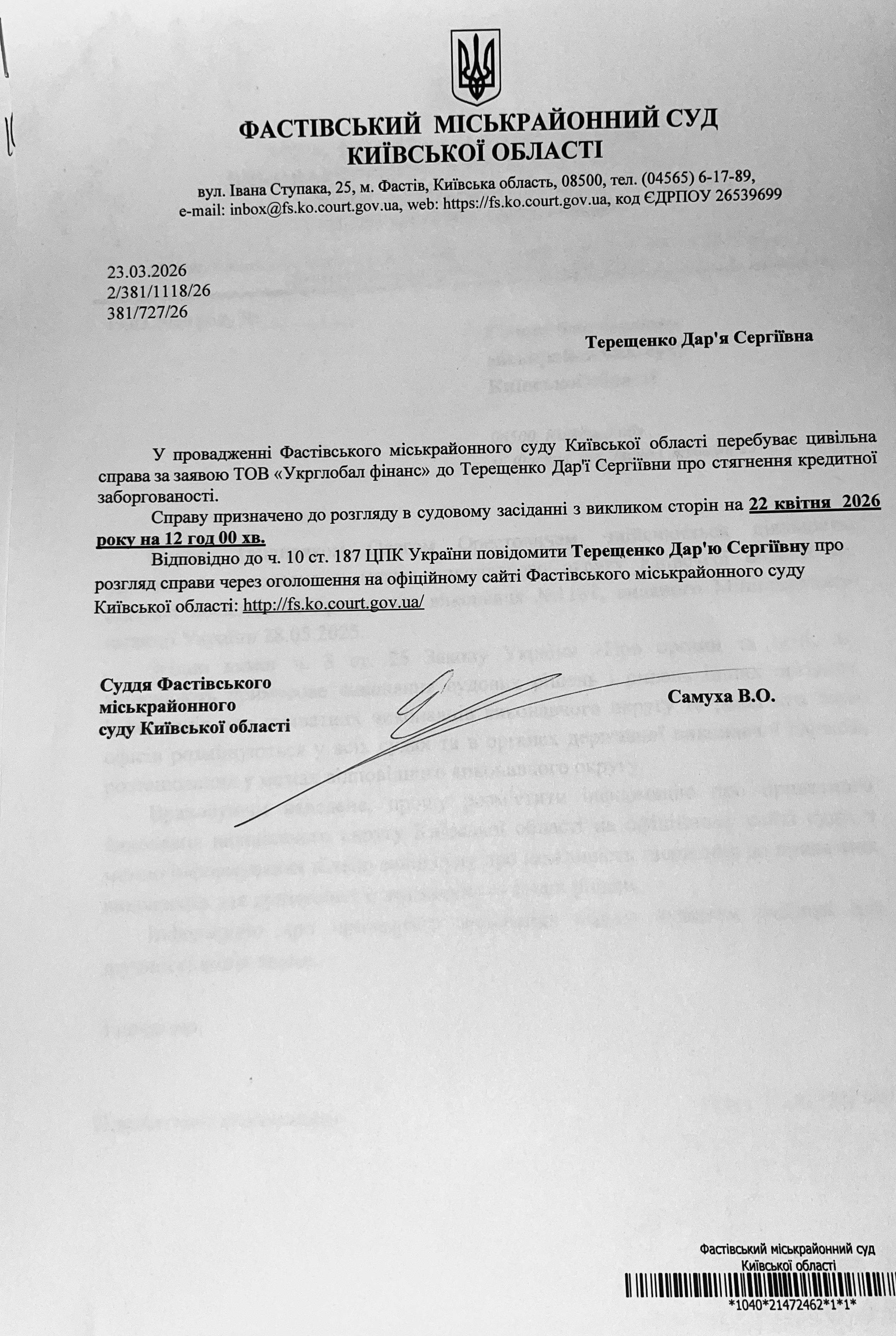 Фастівський міськрайонний суд Київської області викликає Терещенко Дар'ю Сергіївну