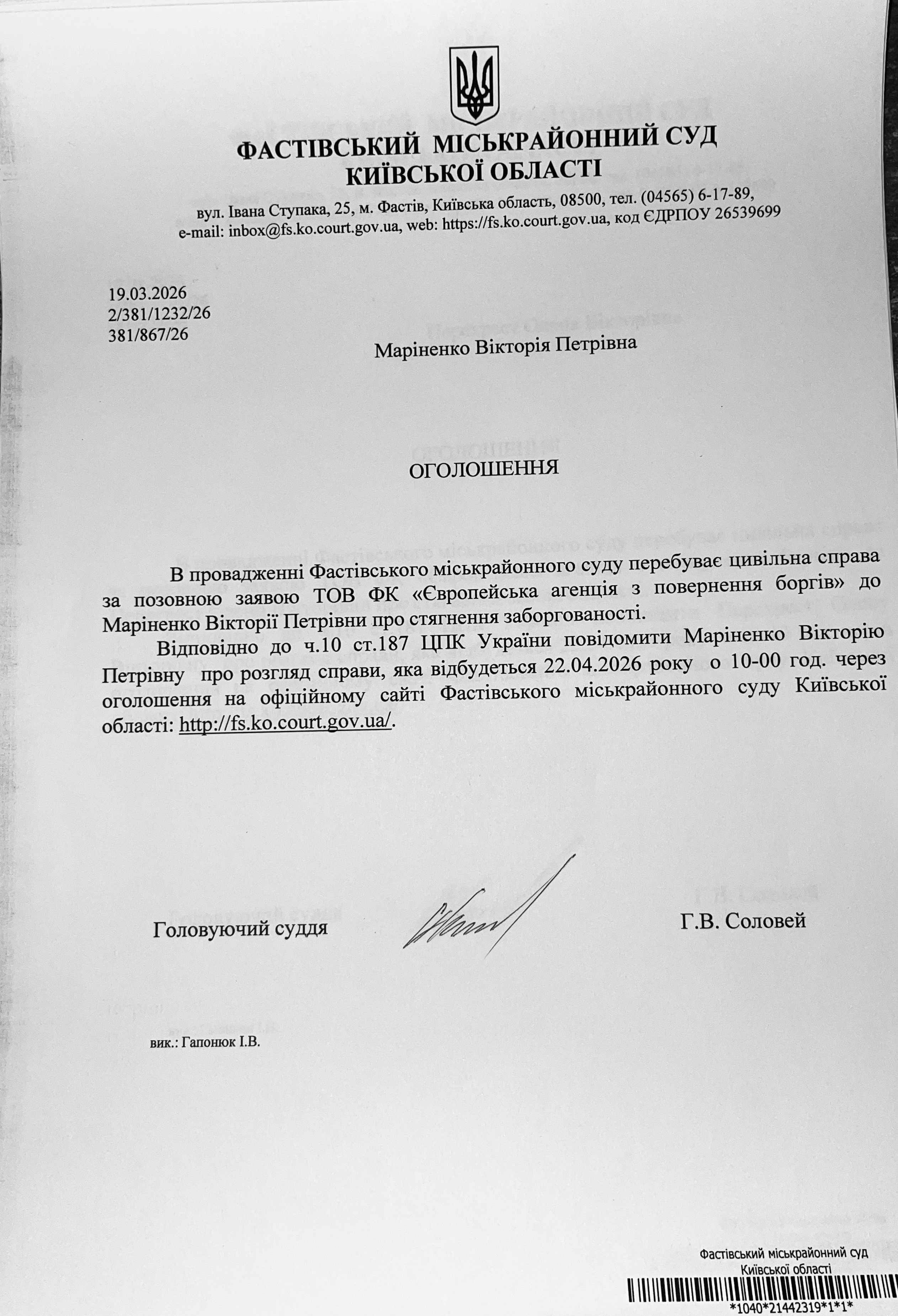 Фастівський міськрайонний суд Київської області викликає Маріненко Вікторію Петрівну