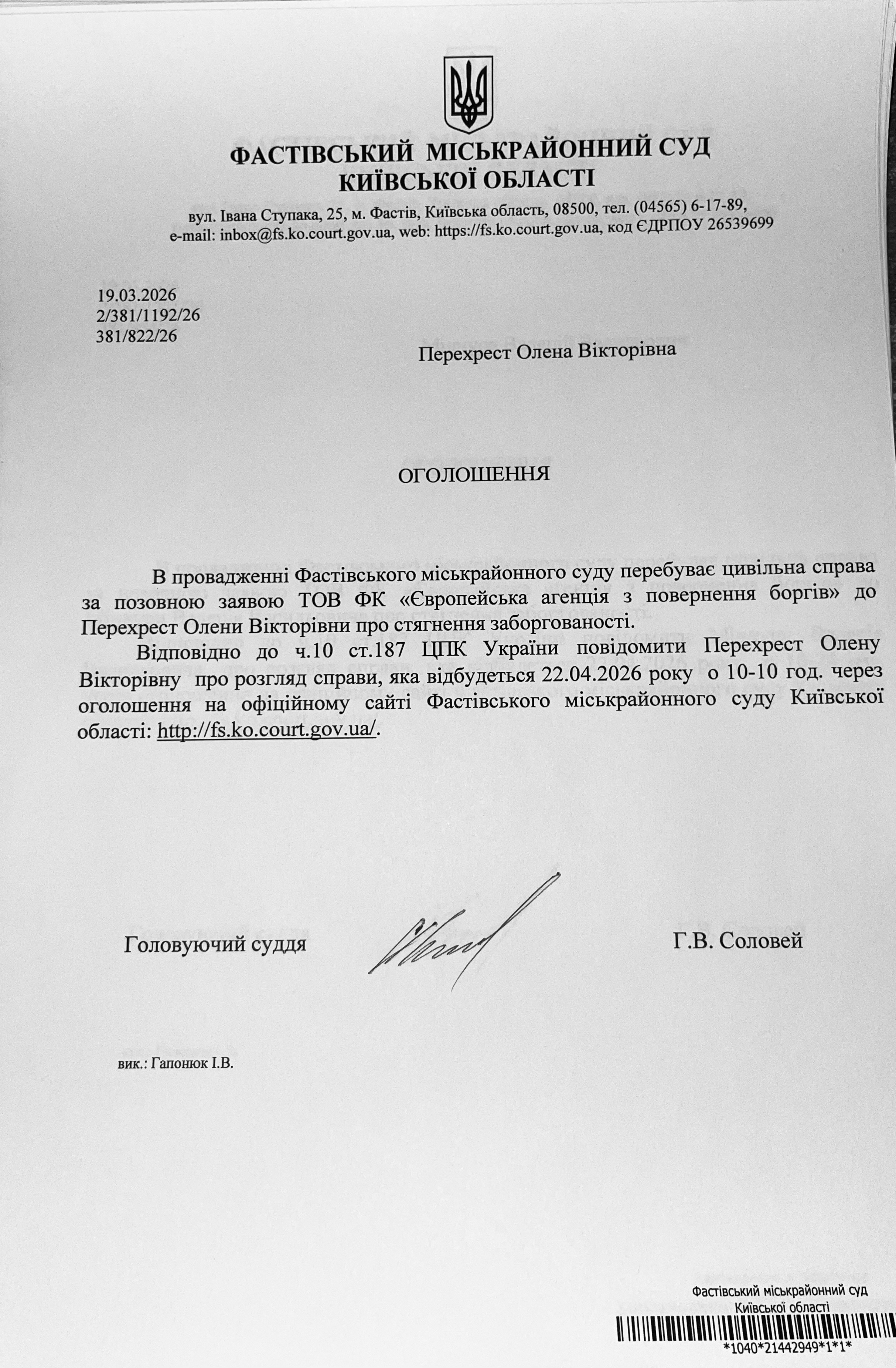 Фастівський міськрайонний суд Київської області викликає Перехрест Олену Вікторівну