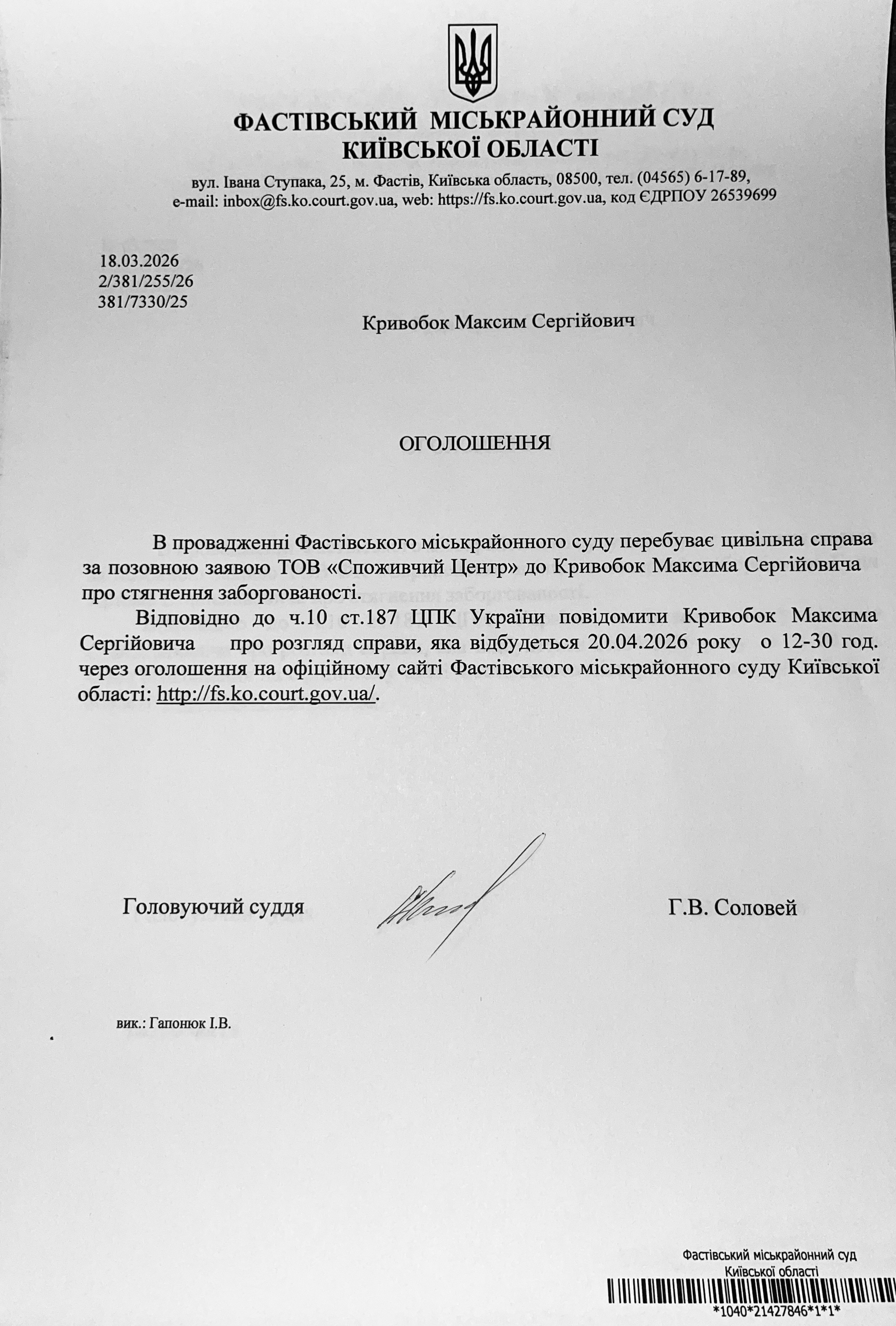 Фастівський міськрайонний суд Київської області викликає Кривобока Максима Сергійовича