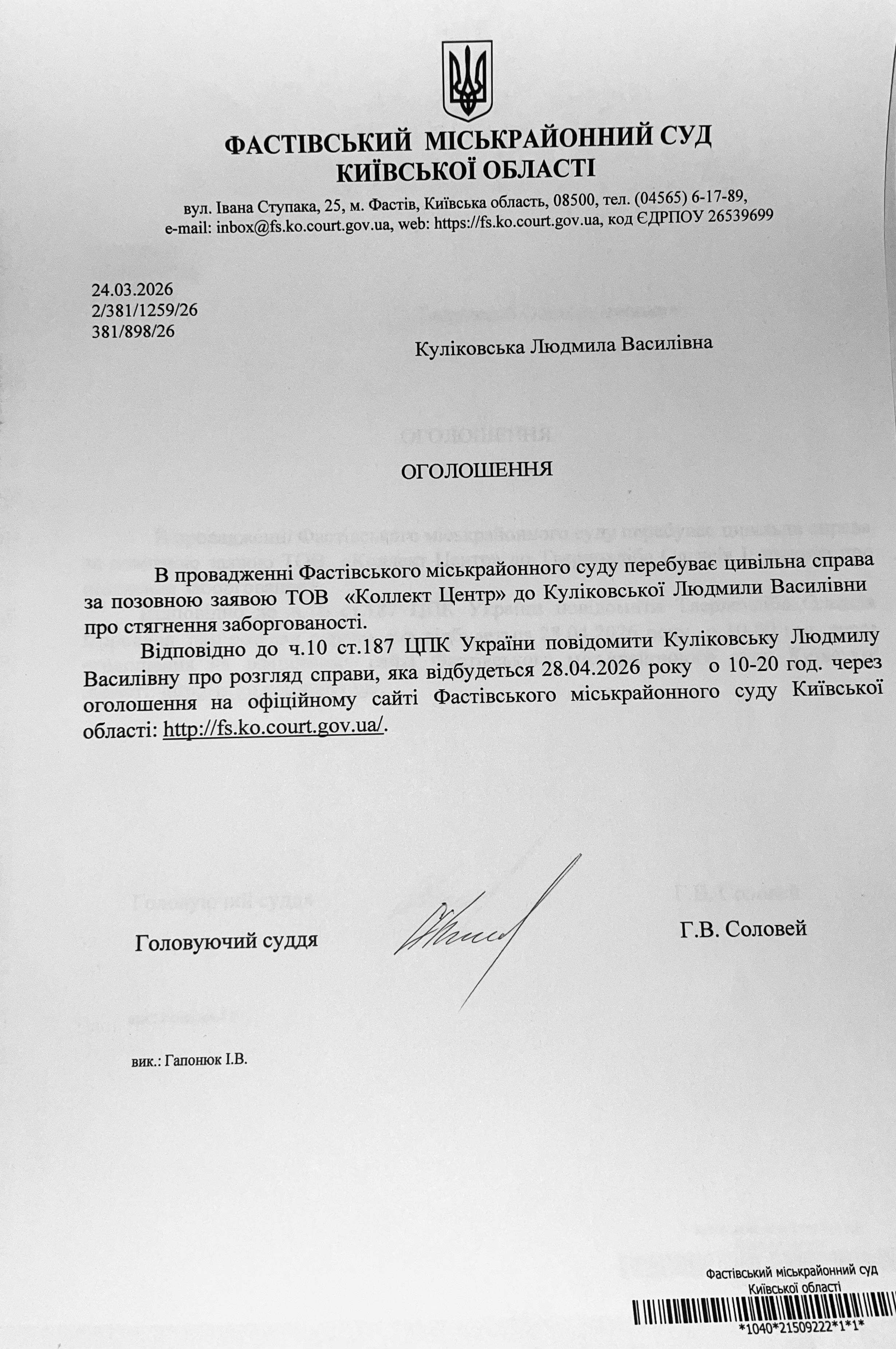 Фастівський міськрайонний суд Київської області викликає Куліковську Людмилу Василівну