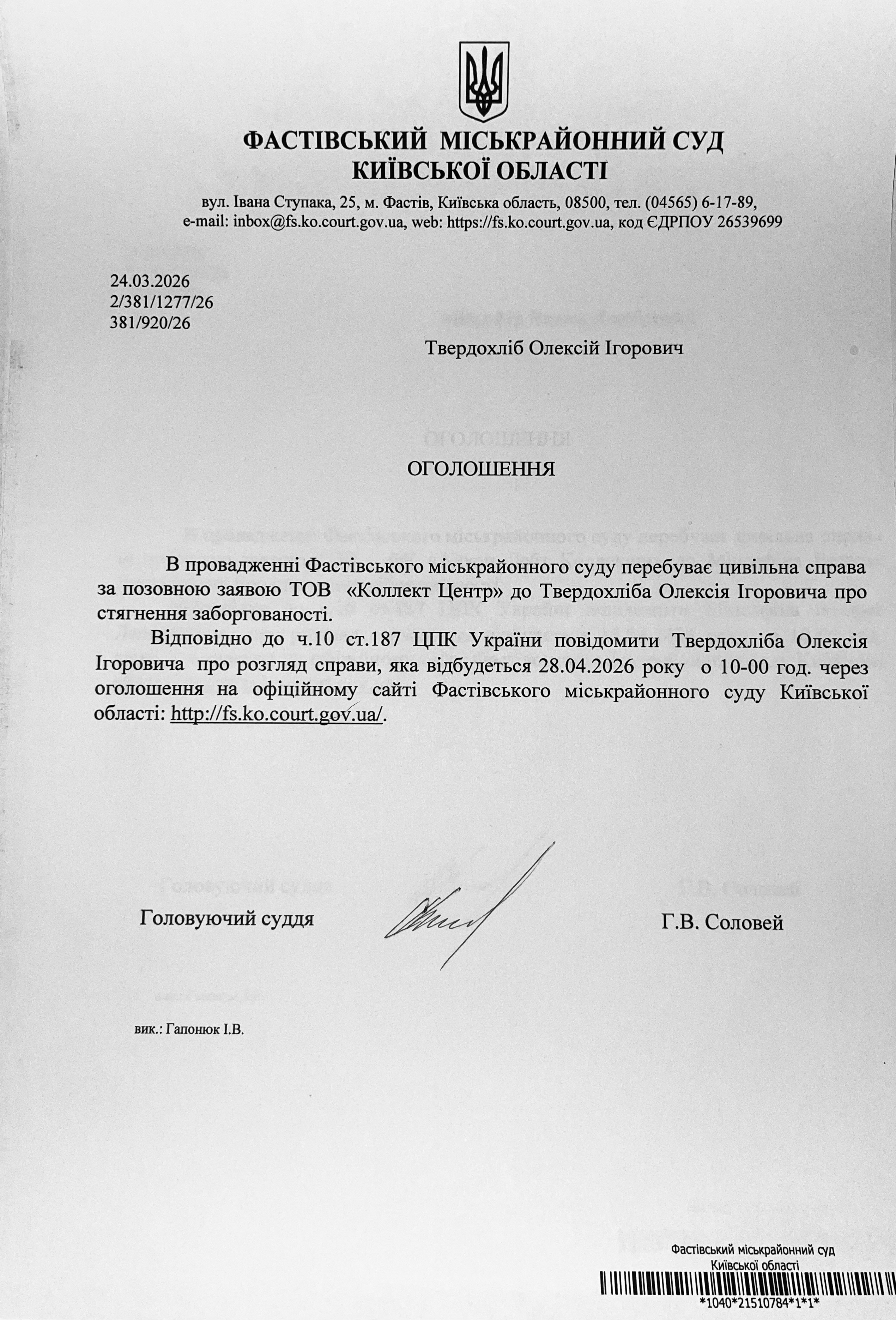 Фастівський міськрайонний суд Київської області викликає Твердохліба Олексія Ігоровича