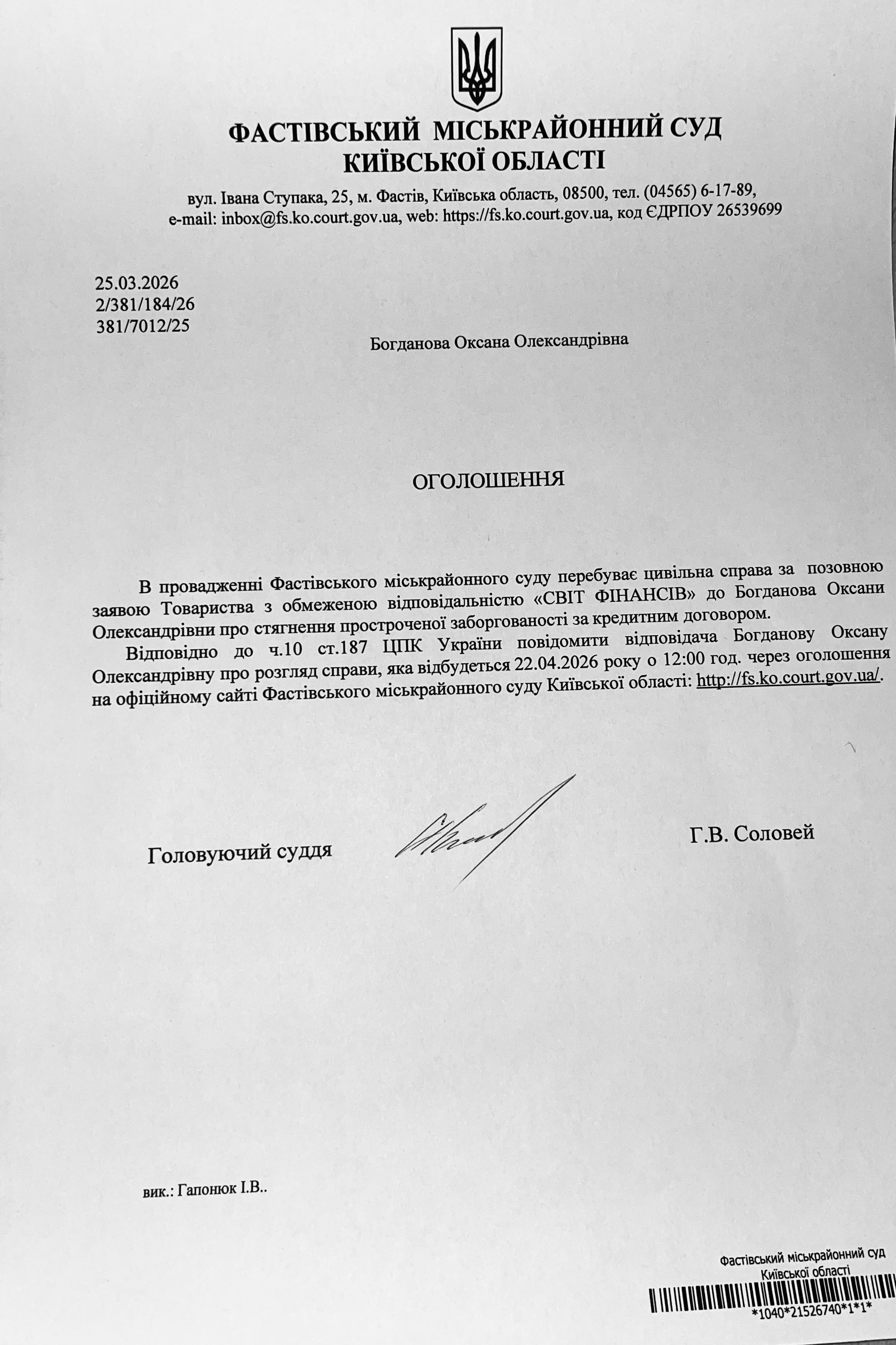 Фастівський міськрайонний суд Київської області викликає Богданову Оксану Олександрівну