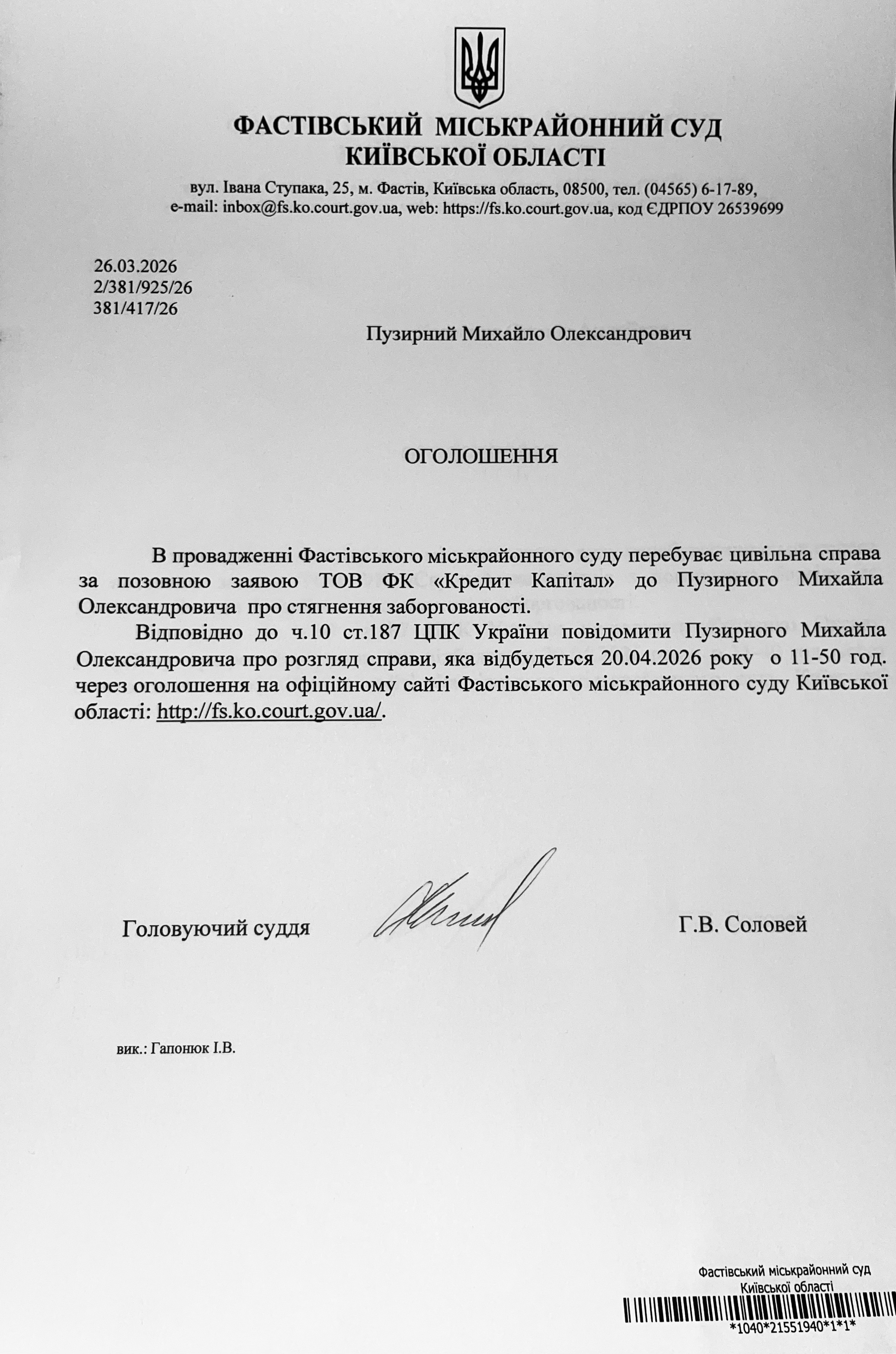 Фастівський міськрайонний суд Київської області викликає Пузирного Михайла Олександровича