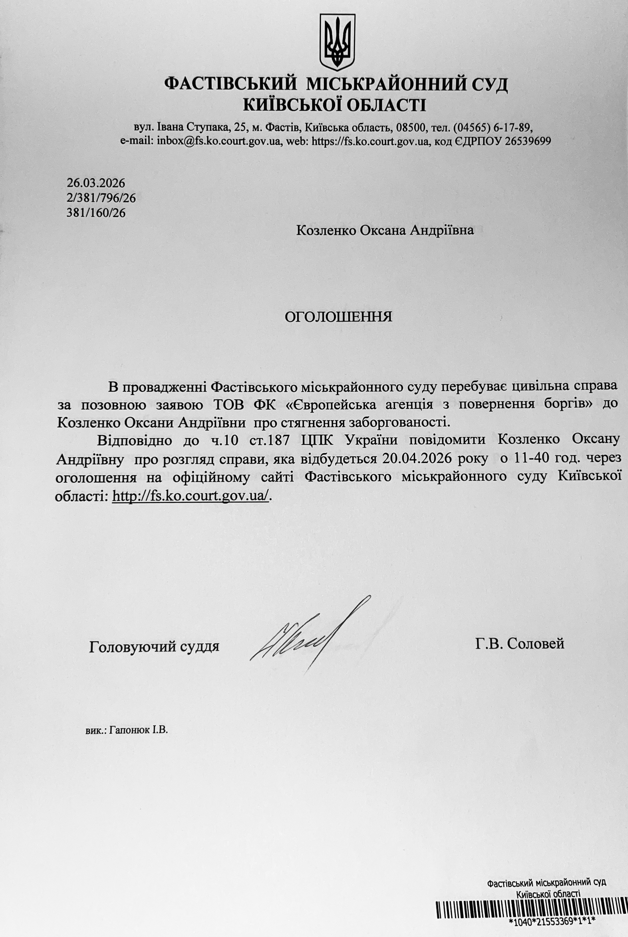 Фастівський міськрайонний суд Київської області викликає Козленко Оксану Андріївну