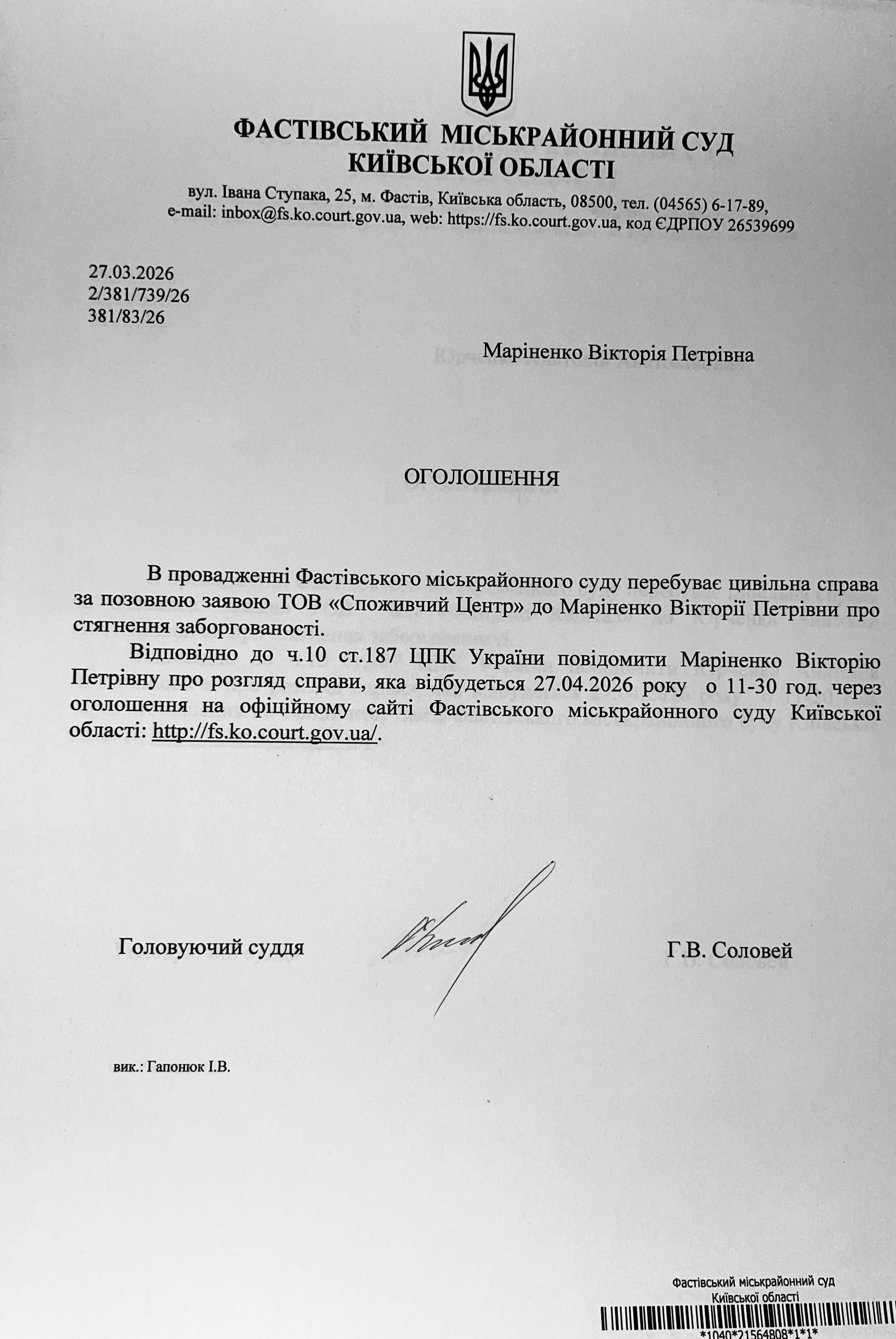 Фастівський міськрайонний суд Київської області викликає Маріненко Вікторію Петрівну