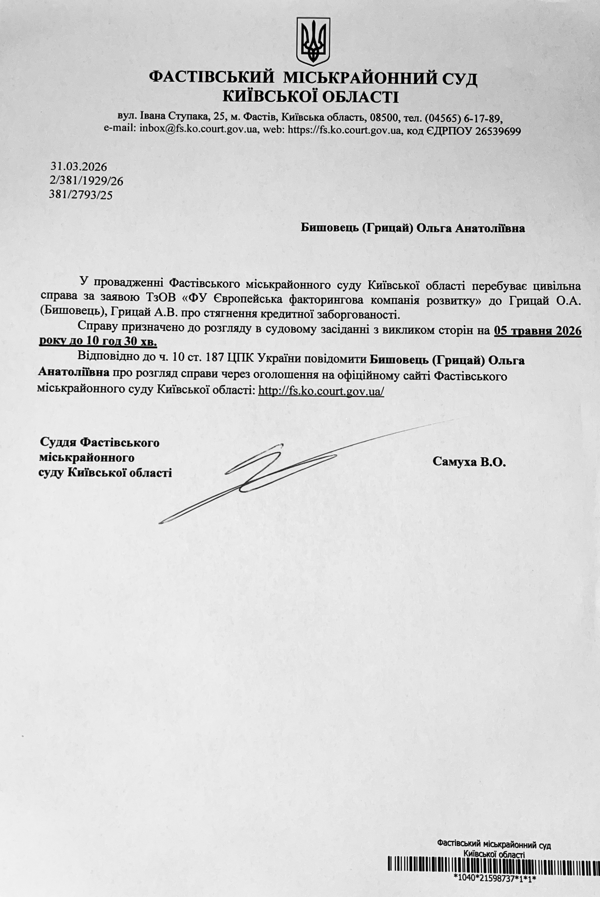 Фастівський міськрайонний суд Київської області викликає Бишовець (Грицай) Ольгу Анатоліївну
