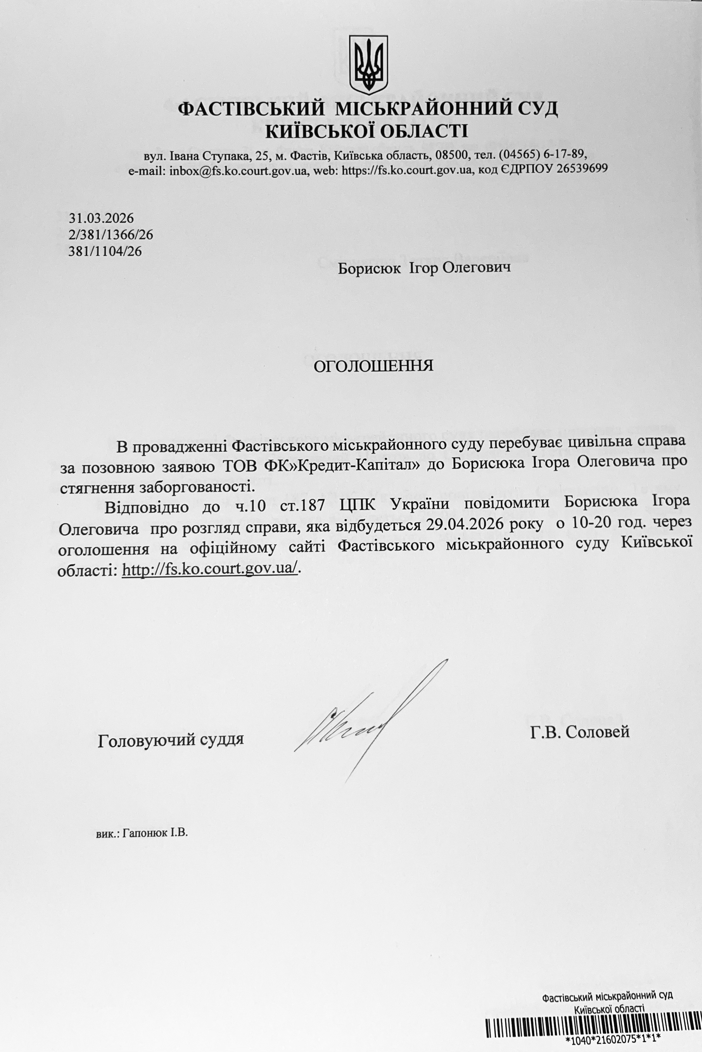 Фастівський міськрайонний суд Київської області викликає Борисюка Ігоря Олеговича