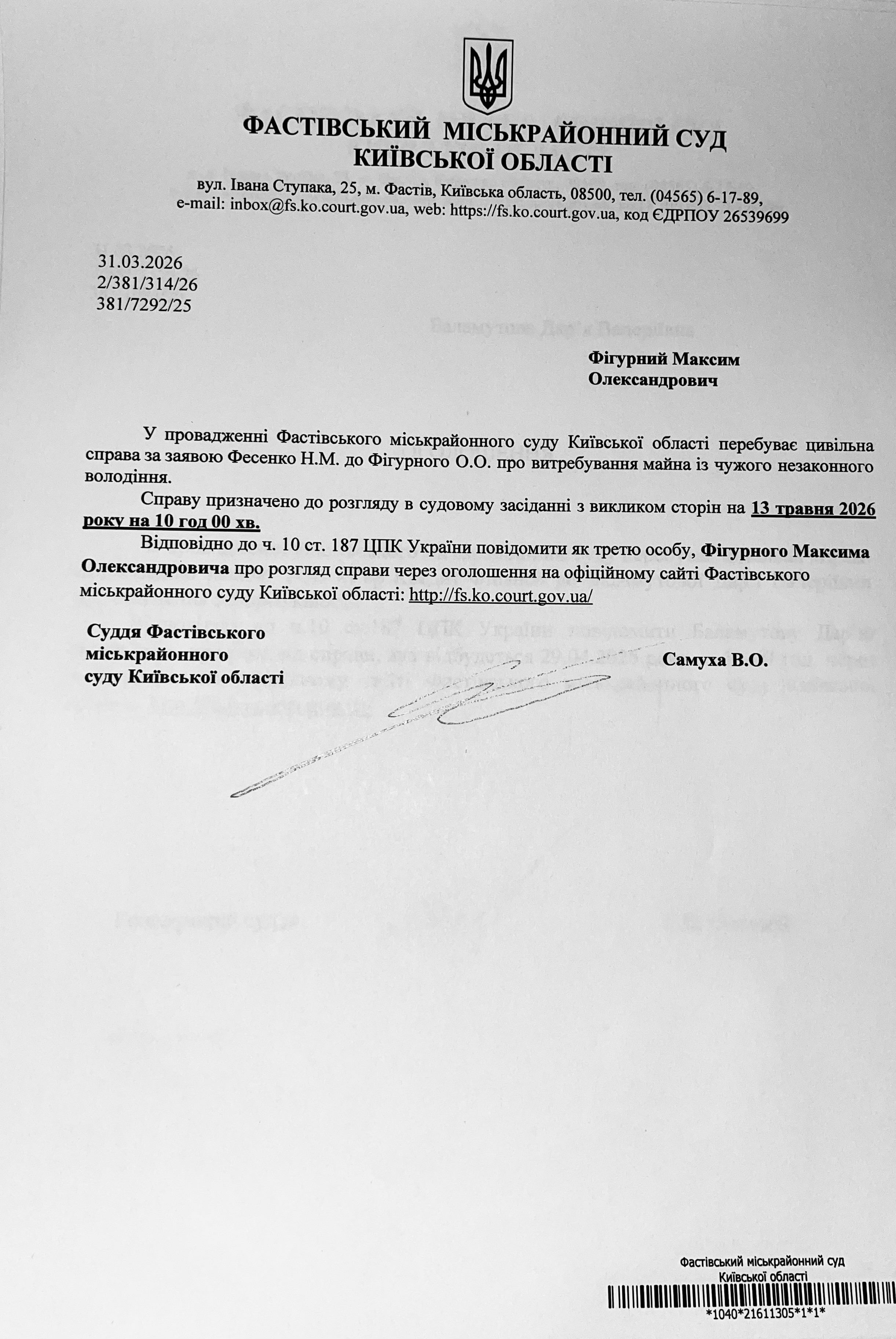 Фастівський міськрайонний суд Київської області викликає Фігурного Максима Олександровича