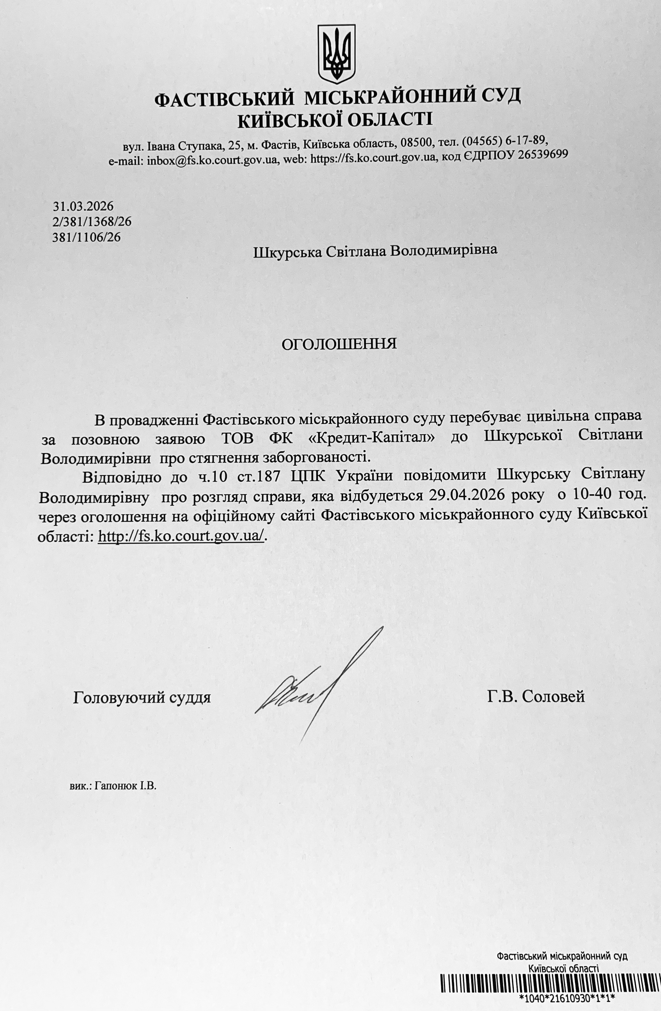 Фастівський міськрайонний суд Київської області викликає Шкурську Світлану Володимирівну