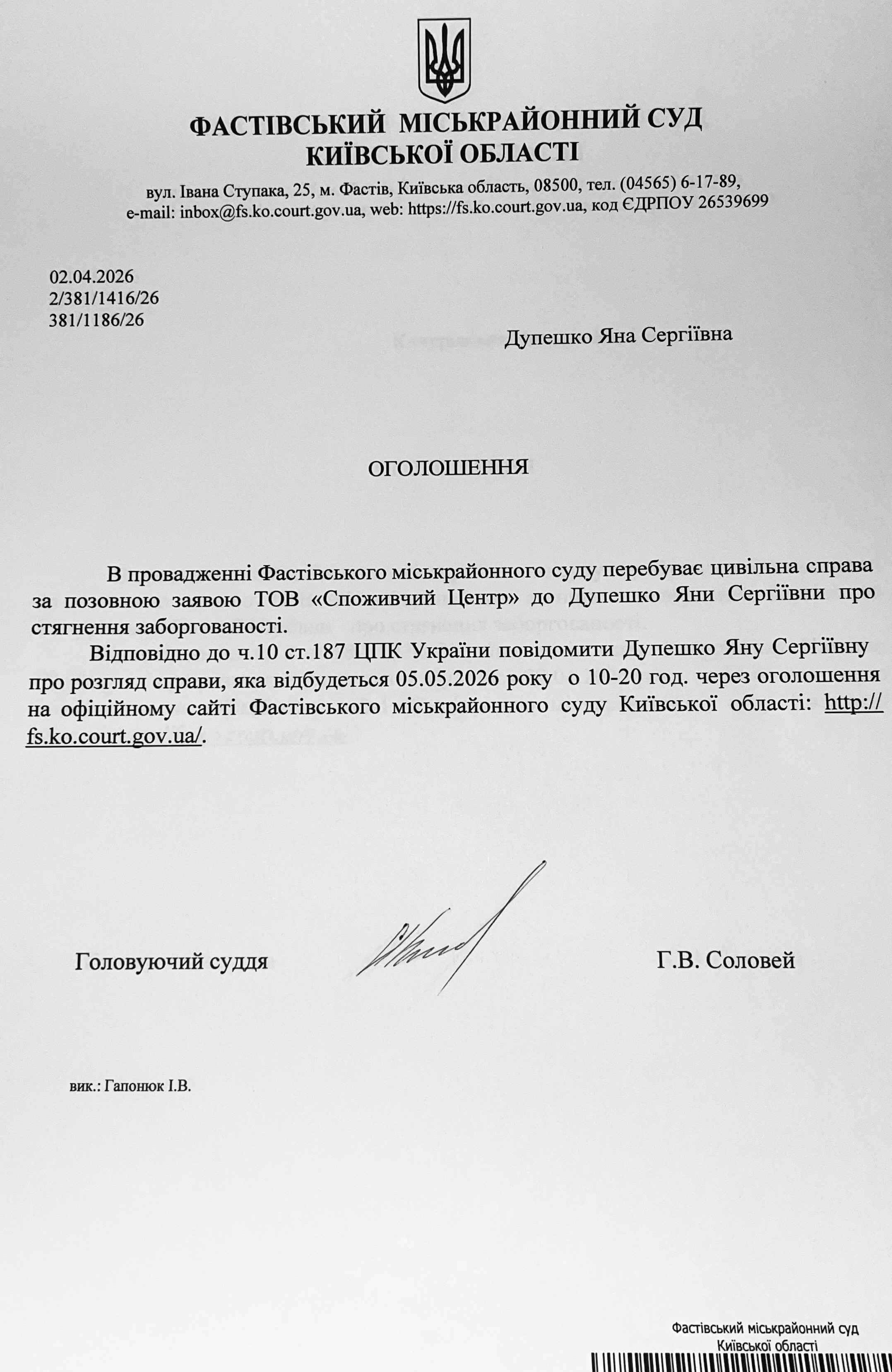 Фастівський міськрайонний суд Київської області викликає Дупешко Яну Сергіївну