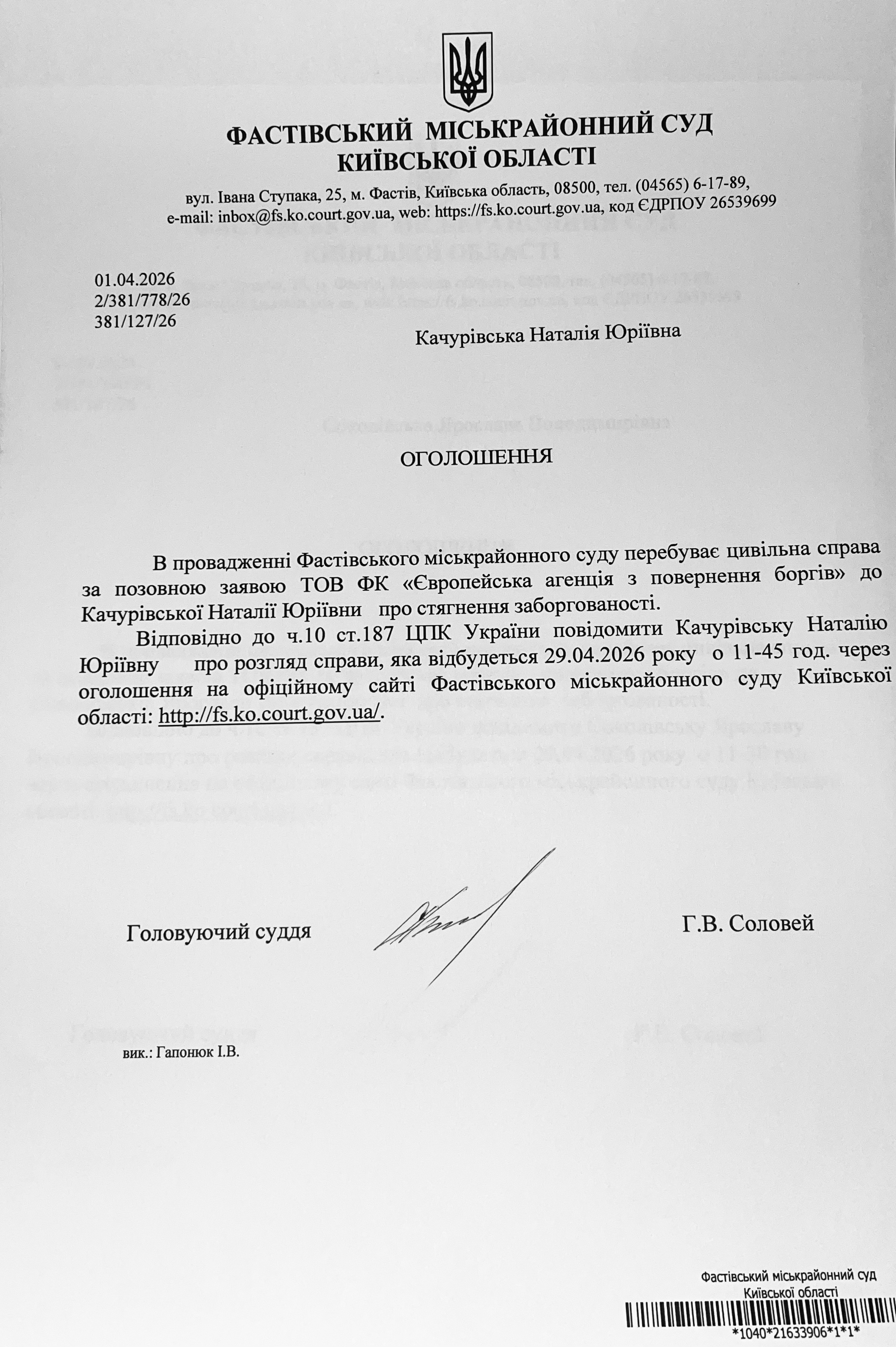 Фастівський міськрайонний суд Київської області викликає Качурівську Наталію Юріївну