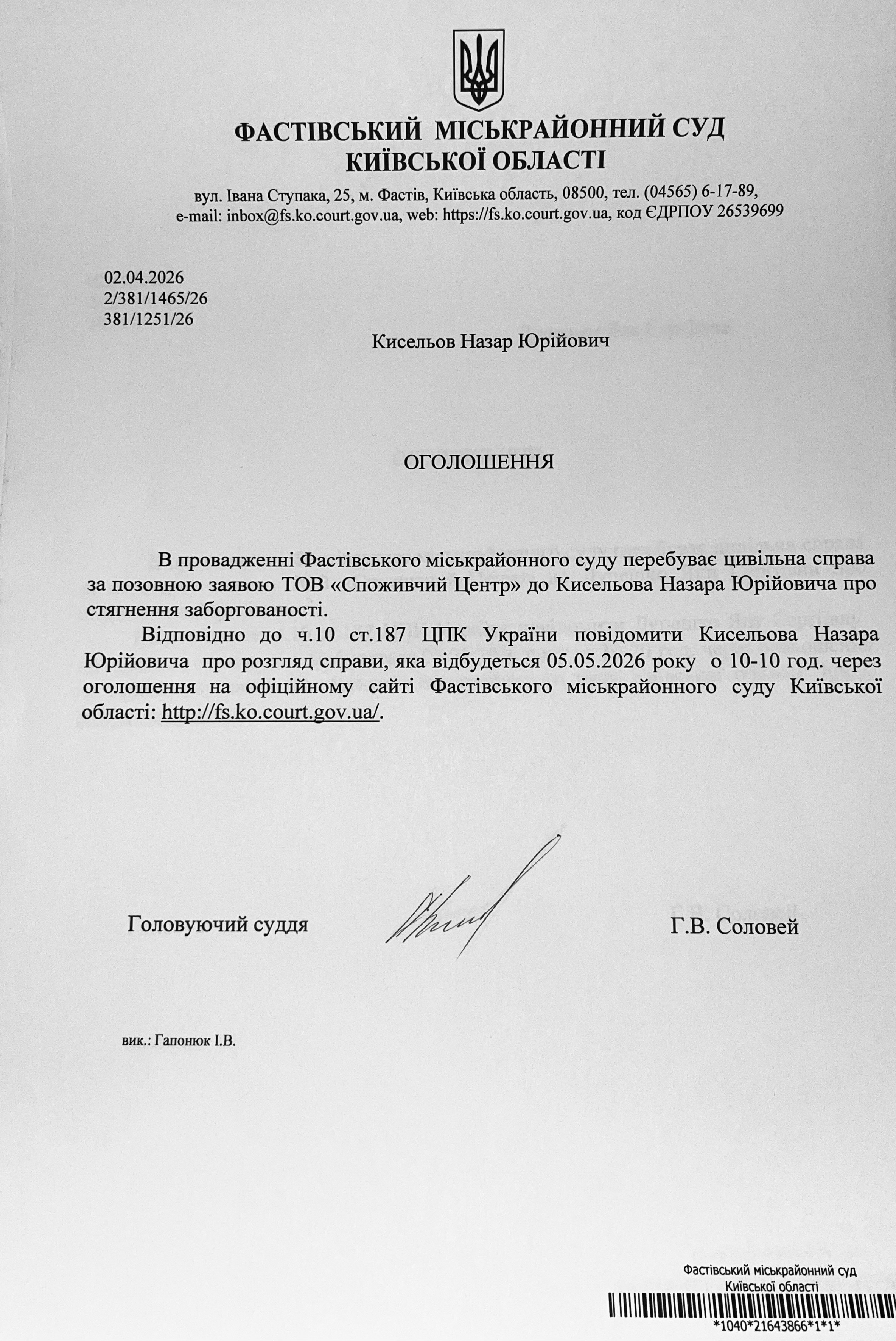 Фастівський міськрайонний суд Київської області викликає Кисельова Назара Юрійовича