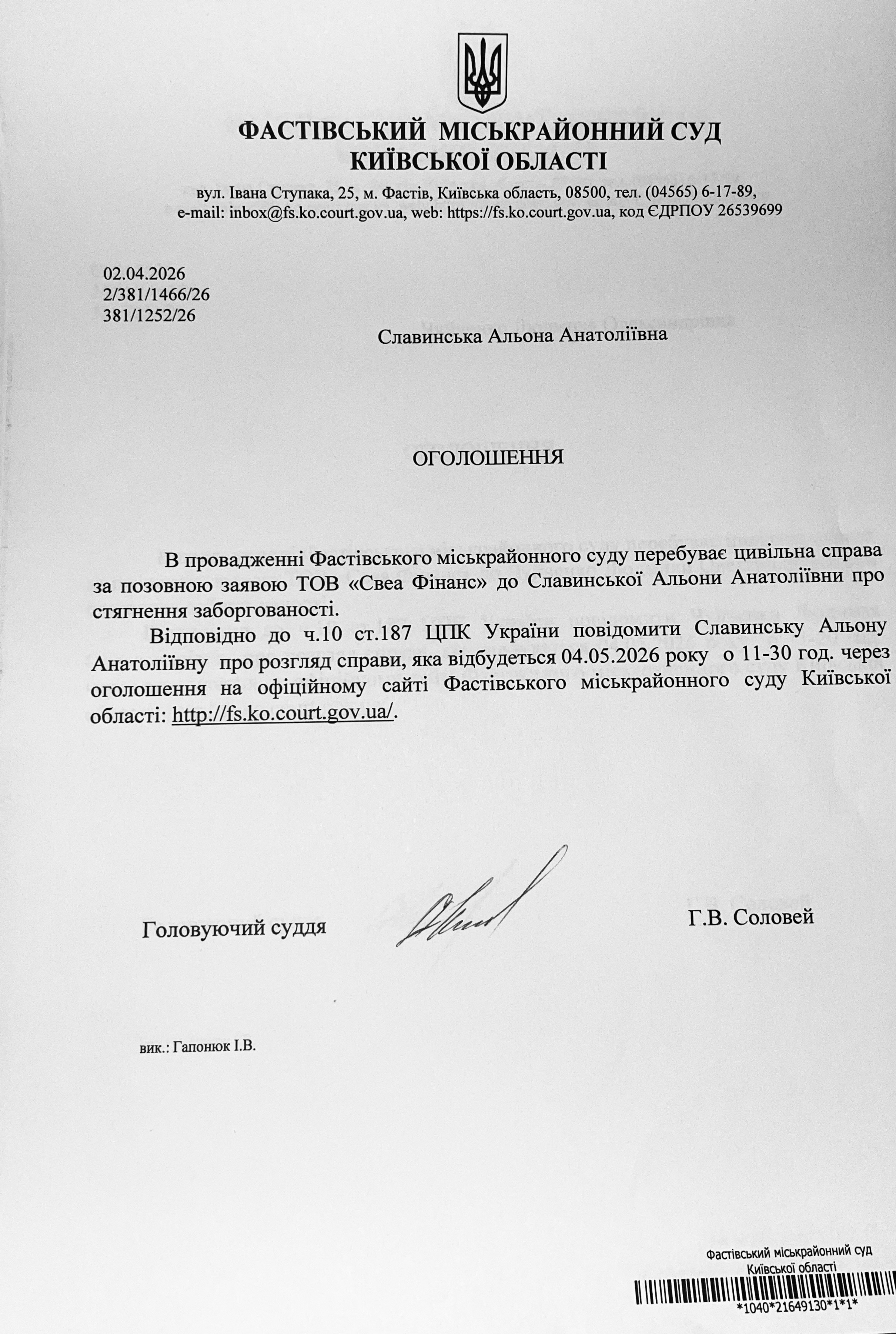Фастівський міськрайонний суд Київської області викликає Славинську Альону Анатоліївну
