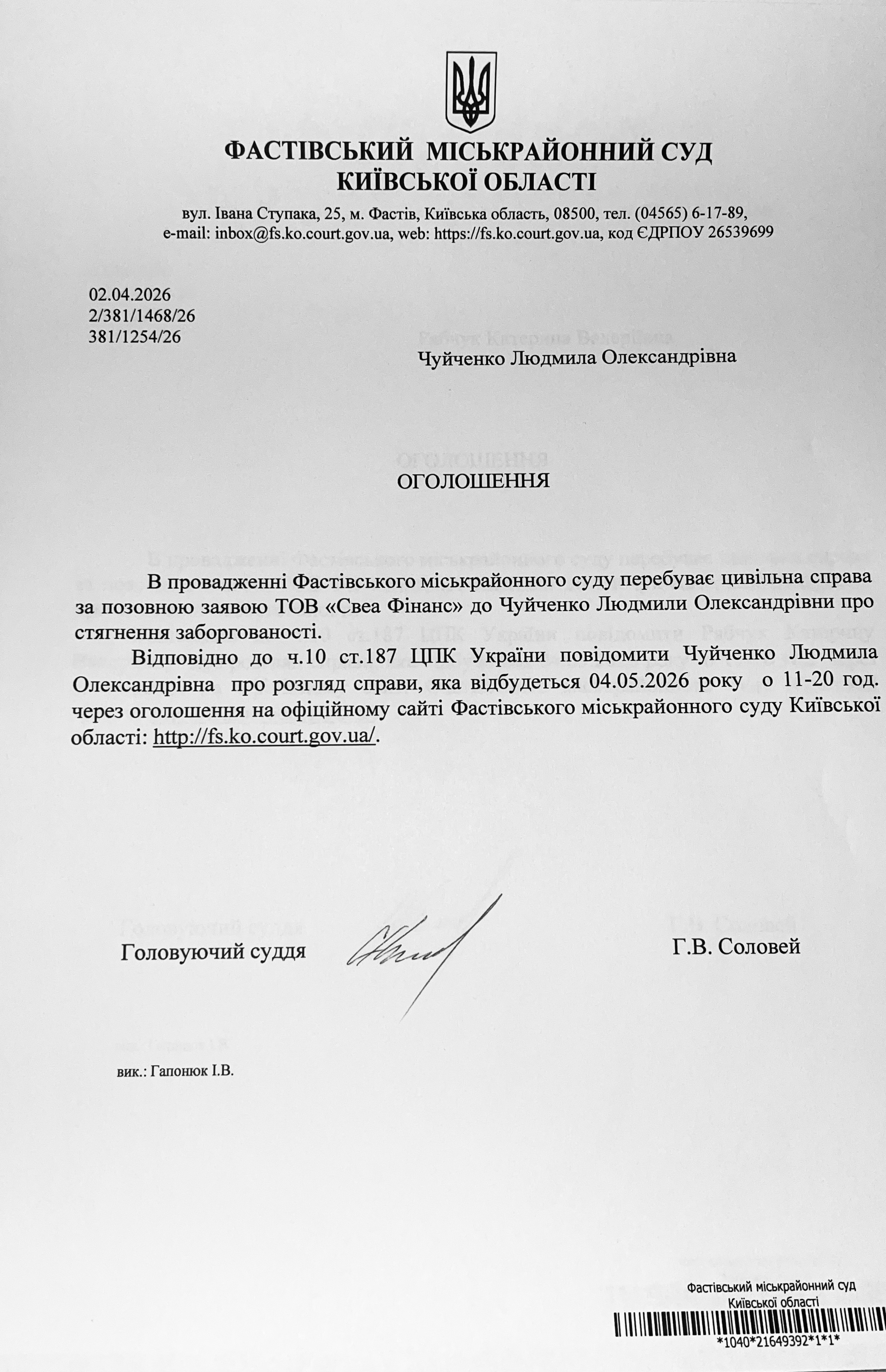 Фастівський міськрайонний суд Київської області викликає Чуйченко Людмилу Олександрівну