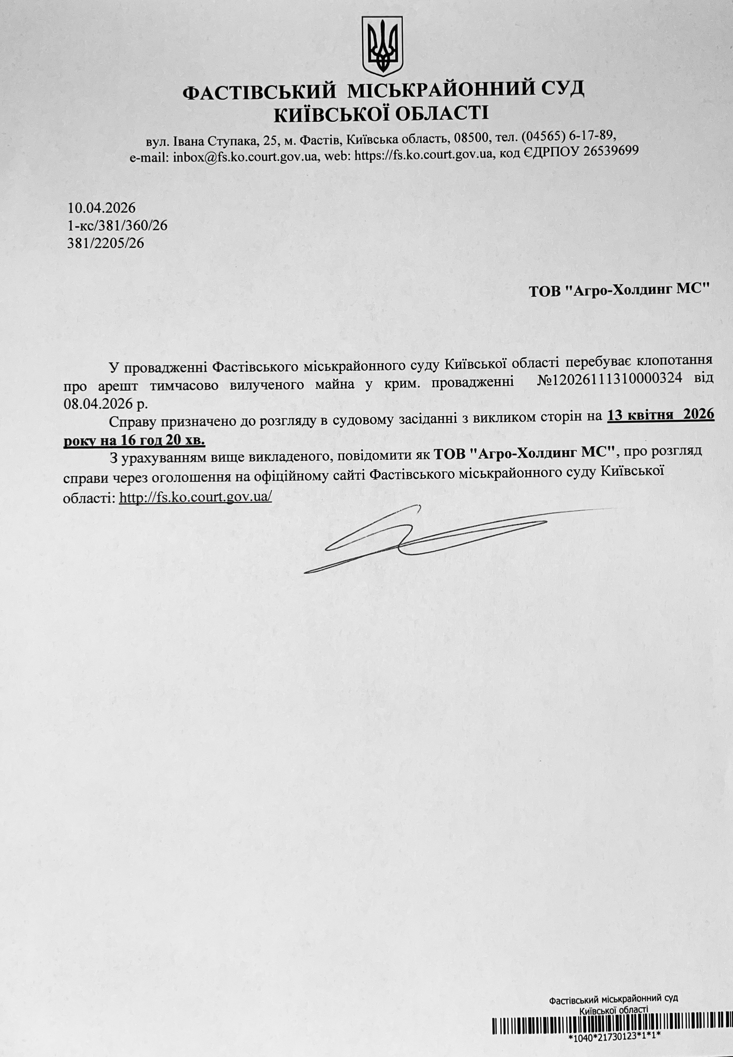 Фастівський міськрайонний суд Київської області повідомляє ТОВ "Агро-Холдинг МС" про розгляд справи 13.04.2026 о 16 год 20 хв