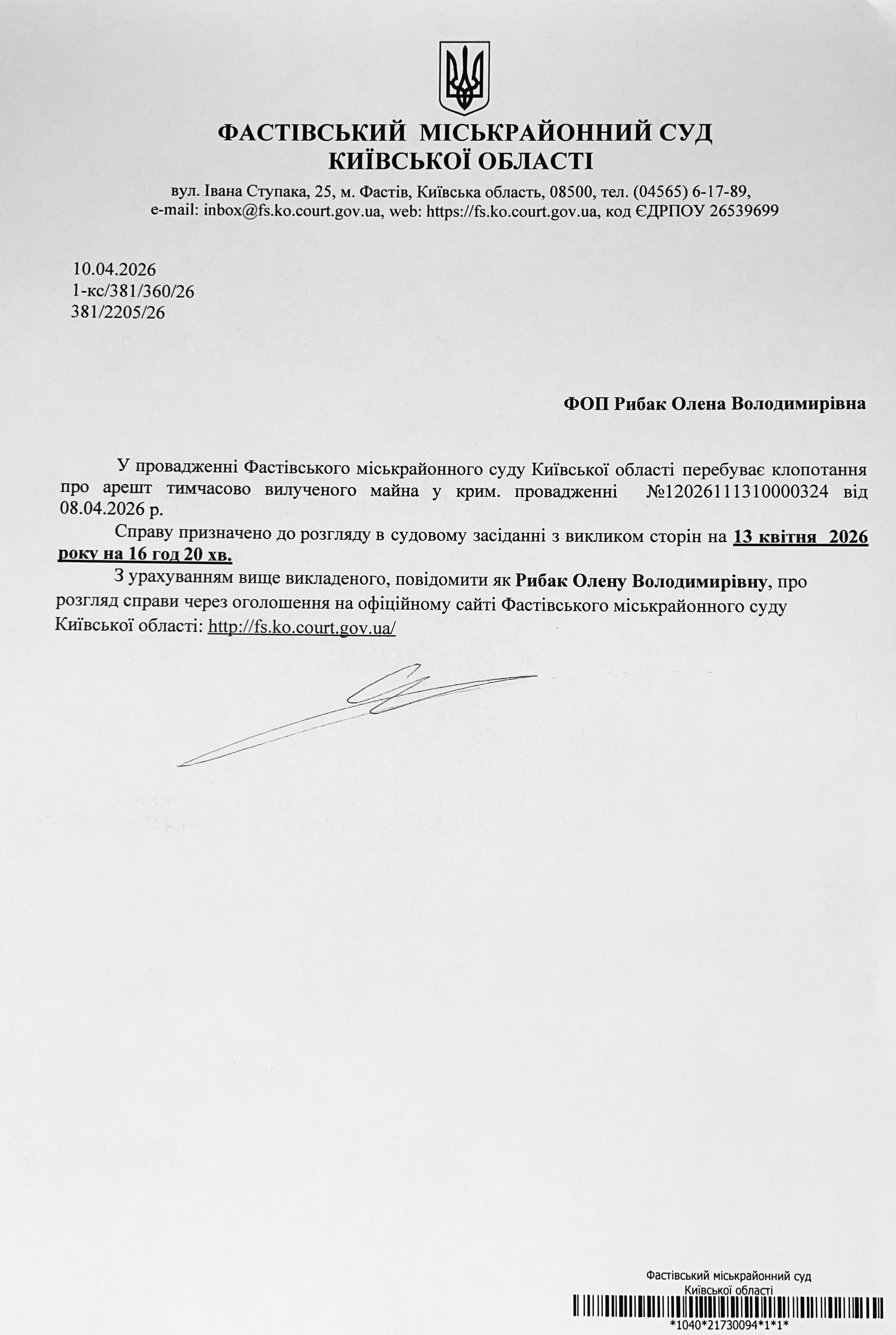 Фастівський міськрайонний суд Київської області викликає ФОП Рибак Олену Володимирівну
