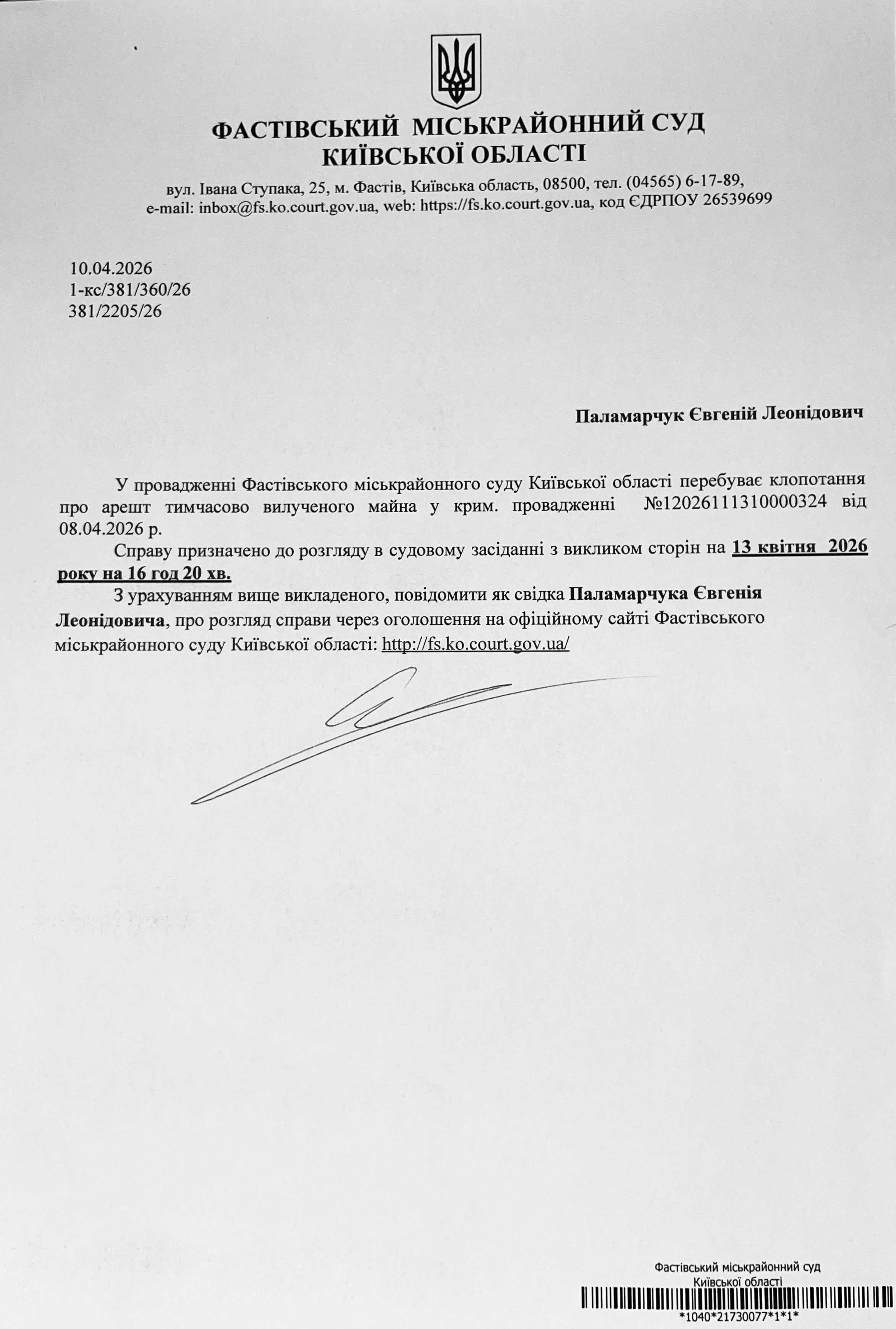 Фастівський міськрайонний суд Київської області викликає Паламарчука Євгенія Леонідовича