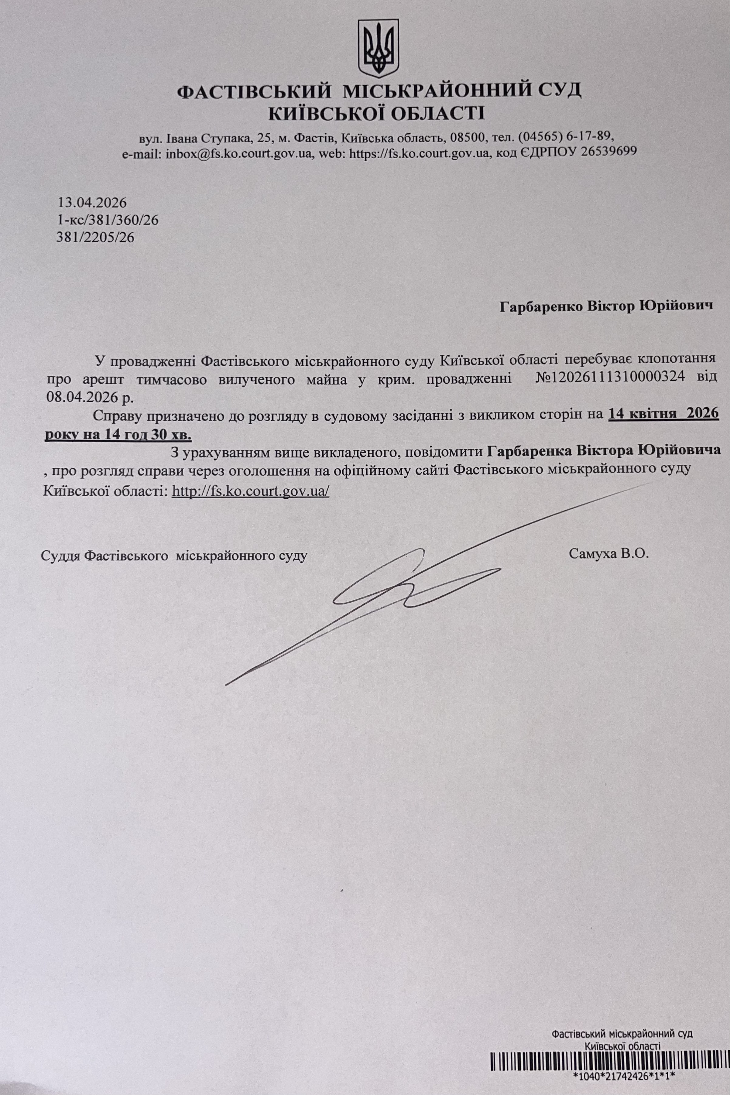 Фастівський міськрайонний суд Київської області викликає Гарбаренка Віктора Юрійовича