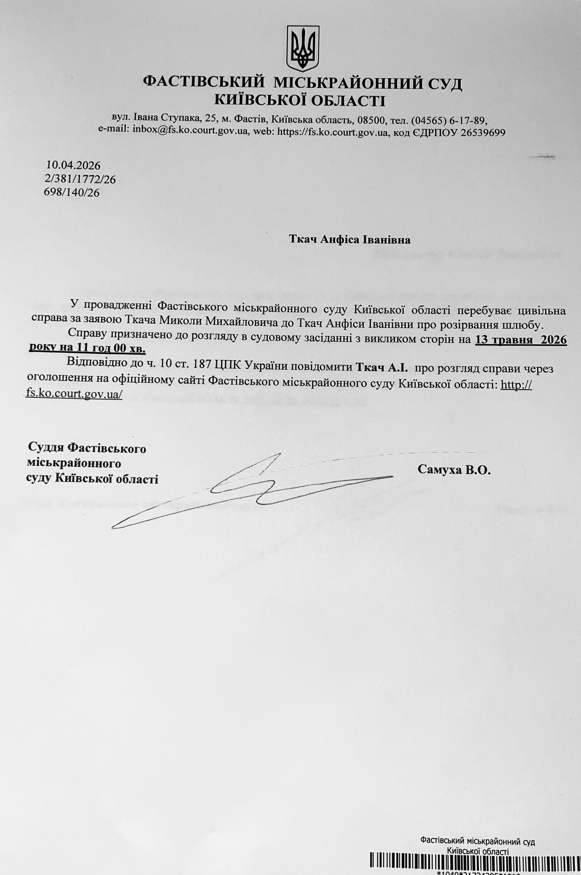 Фастівський міськрайонний суд Київської області викликає Ткач Анфісу Іванівну