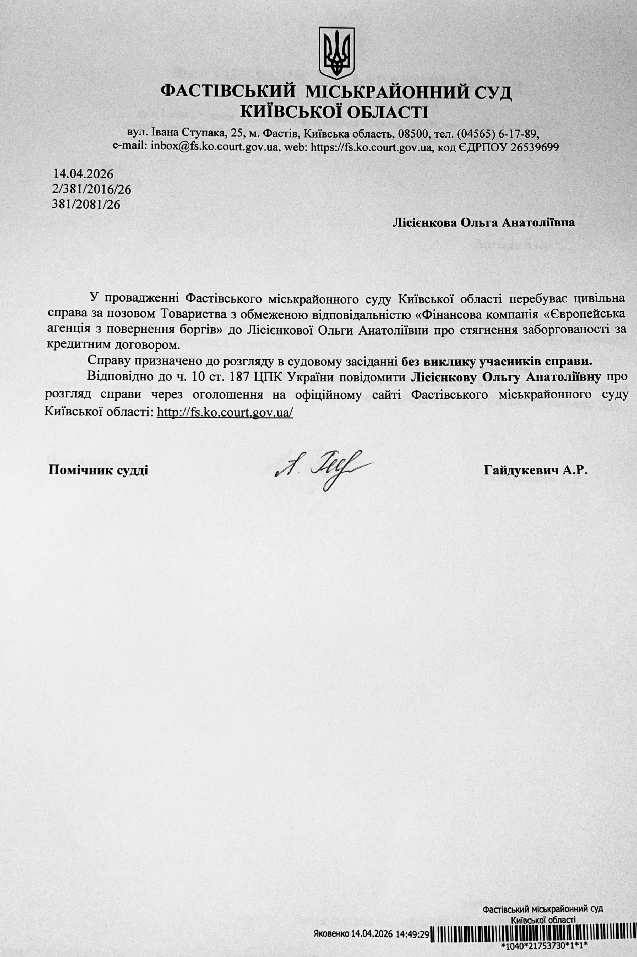Фастівський міськрайонний суд Київської області повідомляє Лісієнкову Ольгу Анатоліївну про розгляд справи без виклику учасників справи