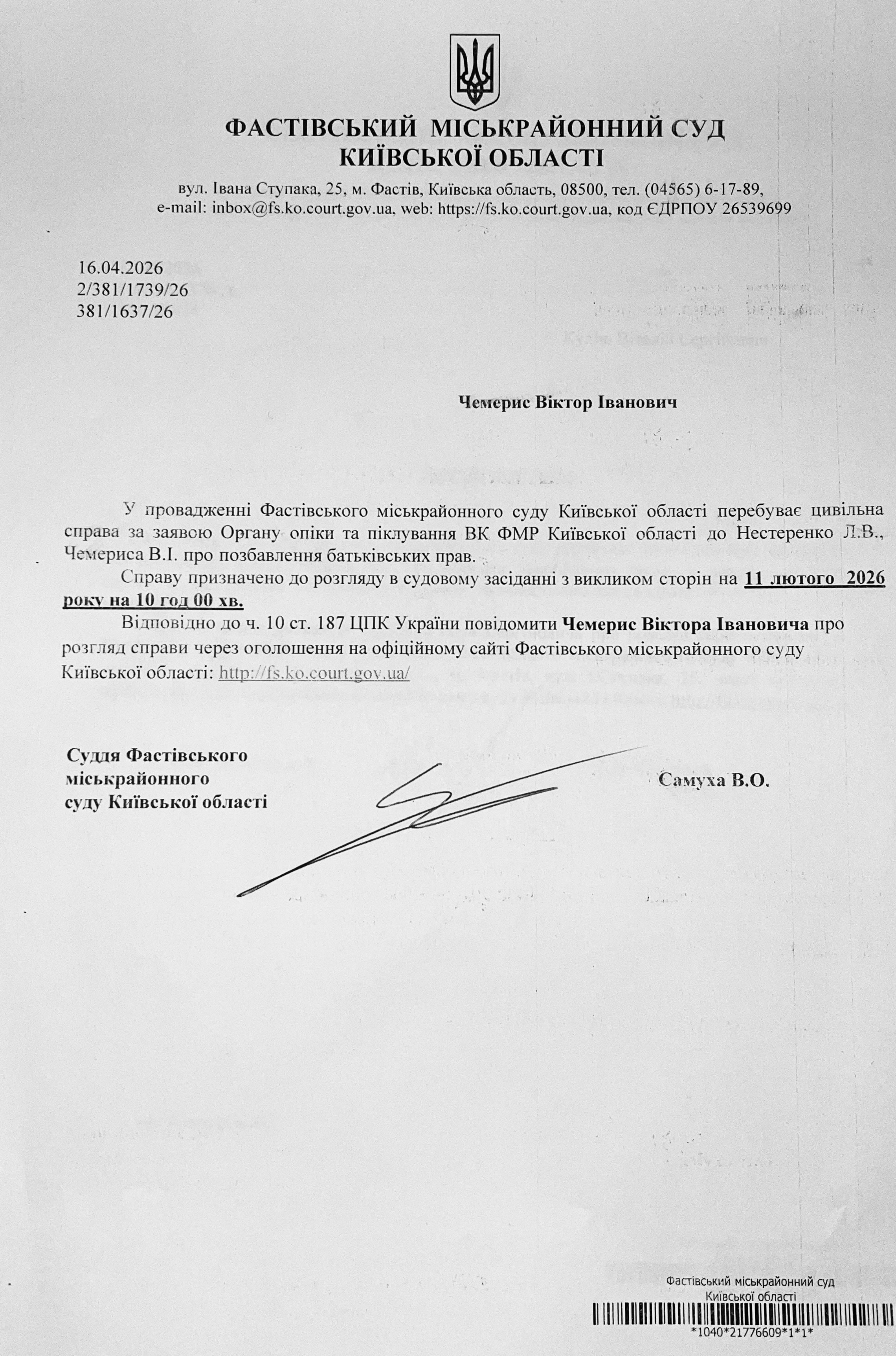 Фастівський міськрайонний суд Київської області викликає Чемериса Віктора Івановича