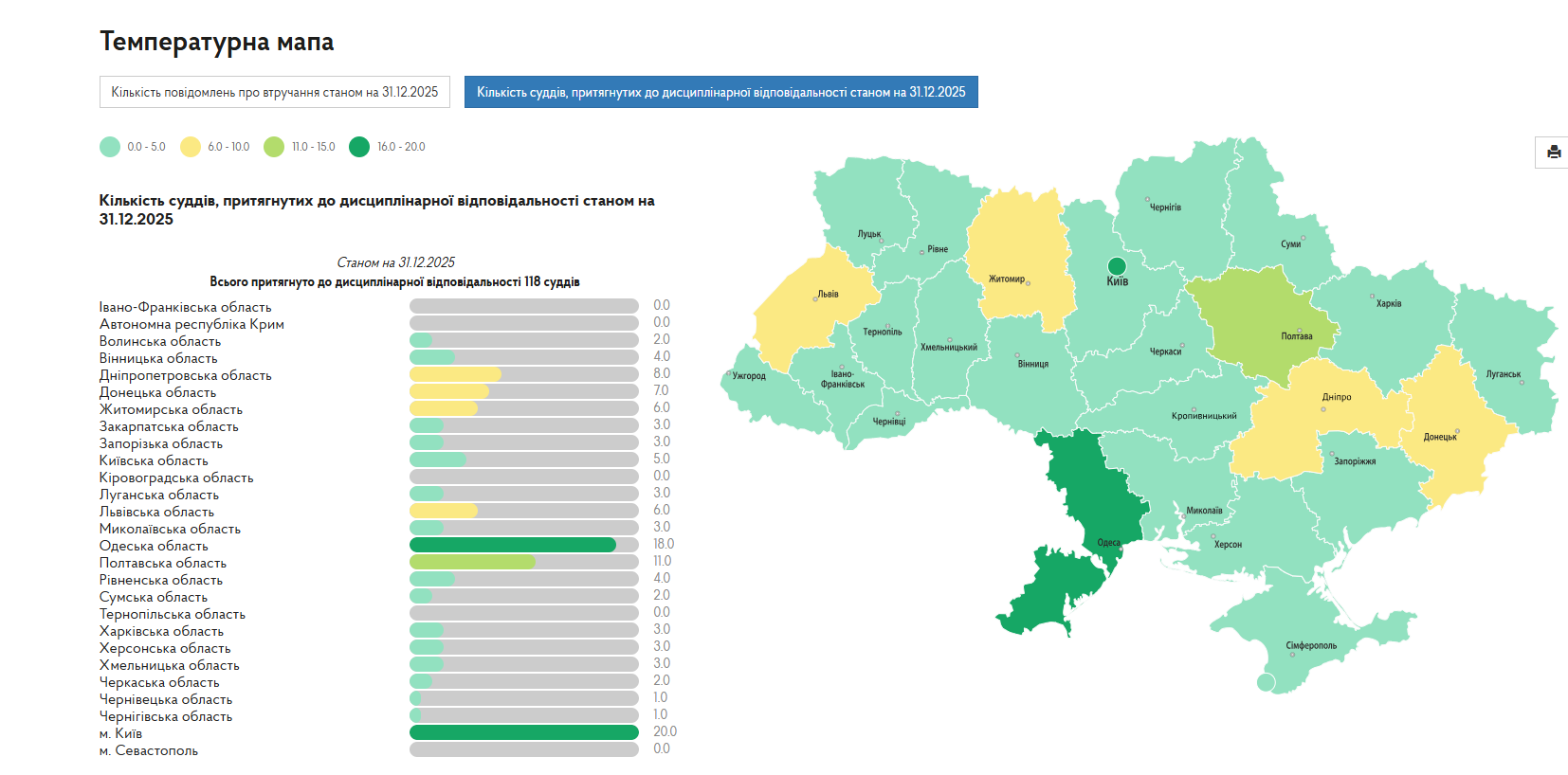 Також працюють температурні мапи, які показують кількість суддів, притягнутих до дисциплінарної відповідальності, та кількість повідомлень про втручання у професійну діяльність суддів щодо здійснення правосуддя у 2025 році.