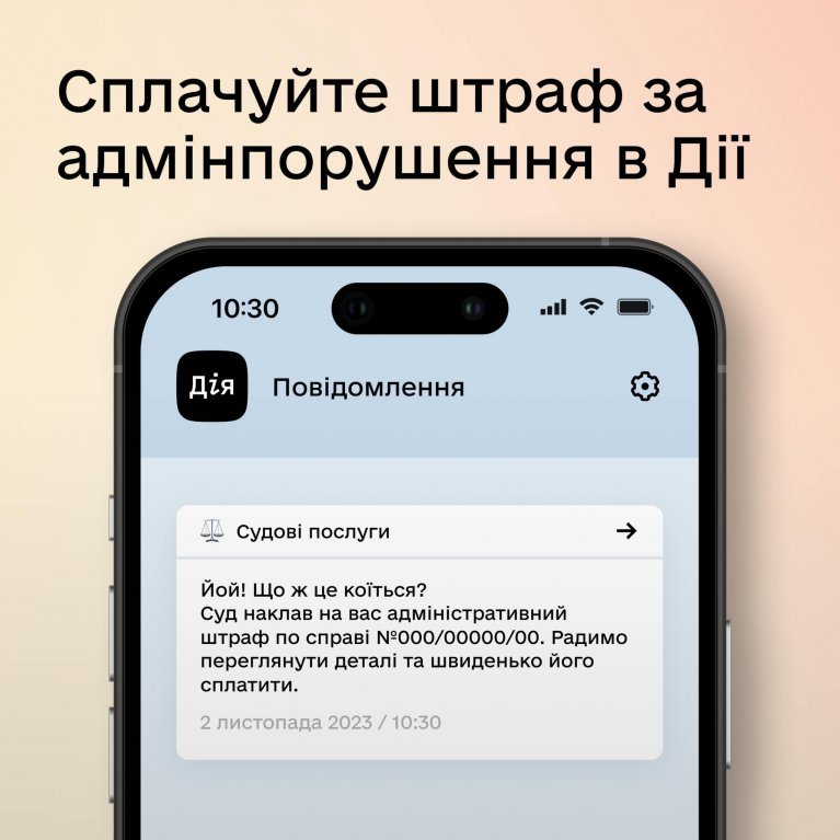 Якщо за результатом розгляду справи на вас накладено штраф, ви отримаєте відповідне сповіщення безпосередньо у застосунку.