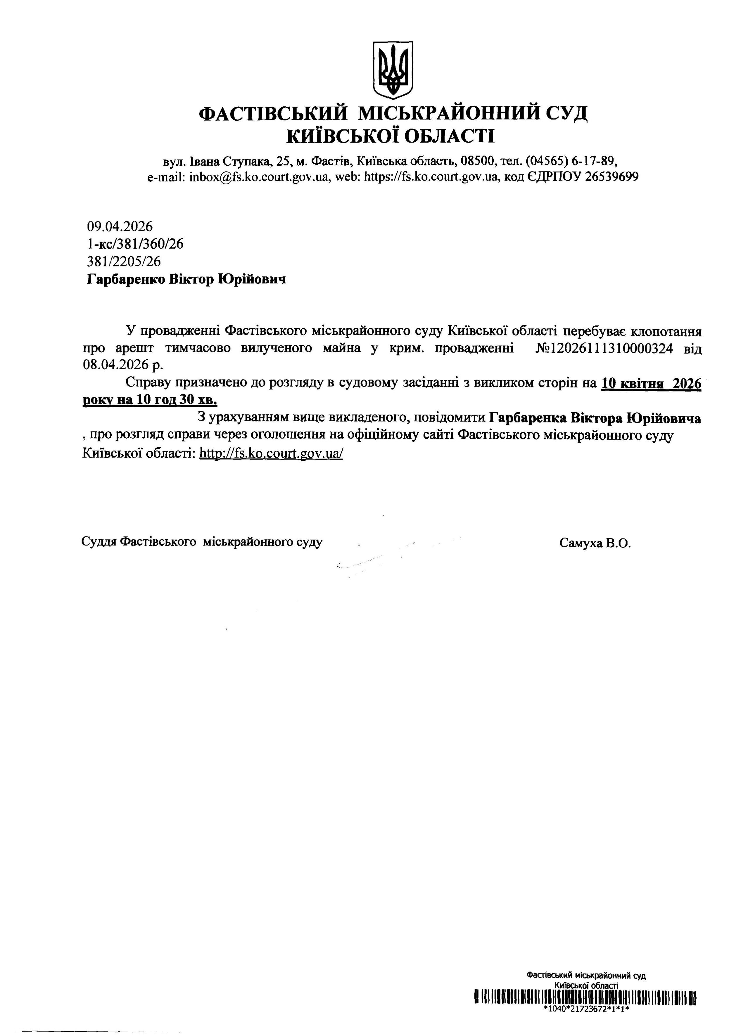 Гарбаренко Віктор Юрійович У провадженні Фастівського міськрайонного суду Київської області перебуває клопотання про арешт тимчасово вилученого майна у крим. провадженні №12026111310000324 від 08.04.2026 р.