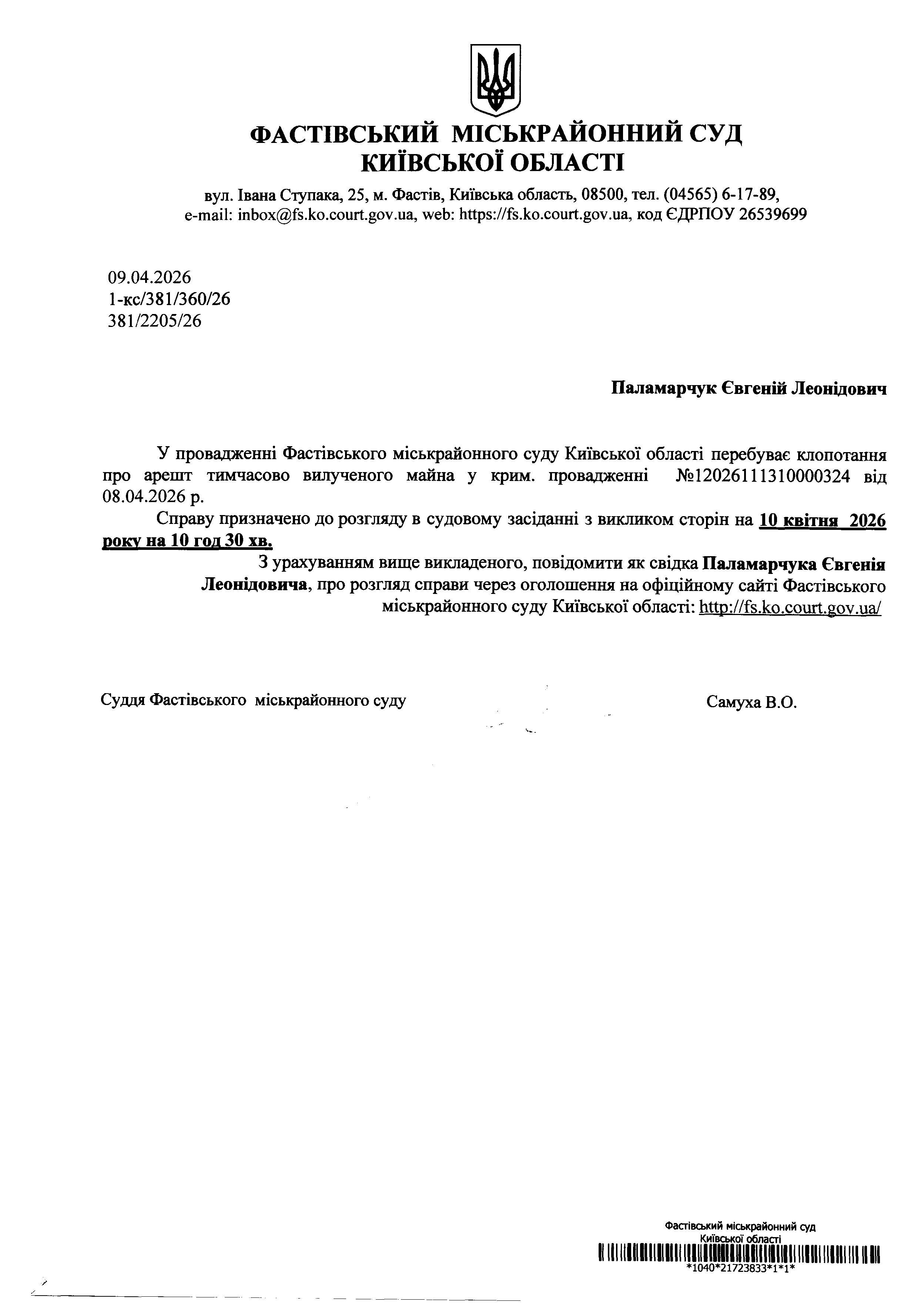 Паламарчук Євгеній Леонідович У провадженні Фастівського міськрайонного суду Київської області перебуває клопотання про арешт тимчасово вилученого майна у крим. провадженні №12026111310000324 від 08.04.2026 р.